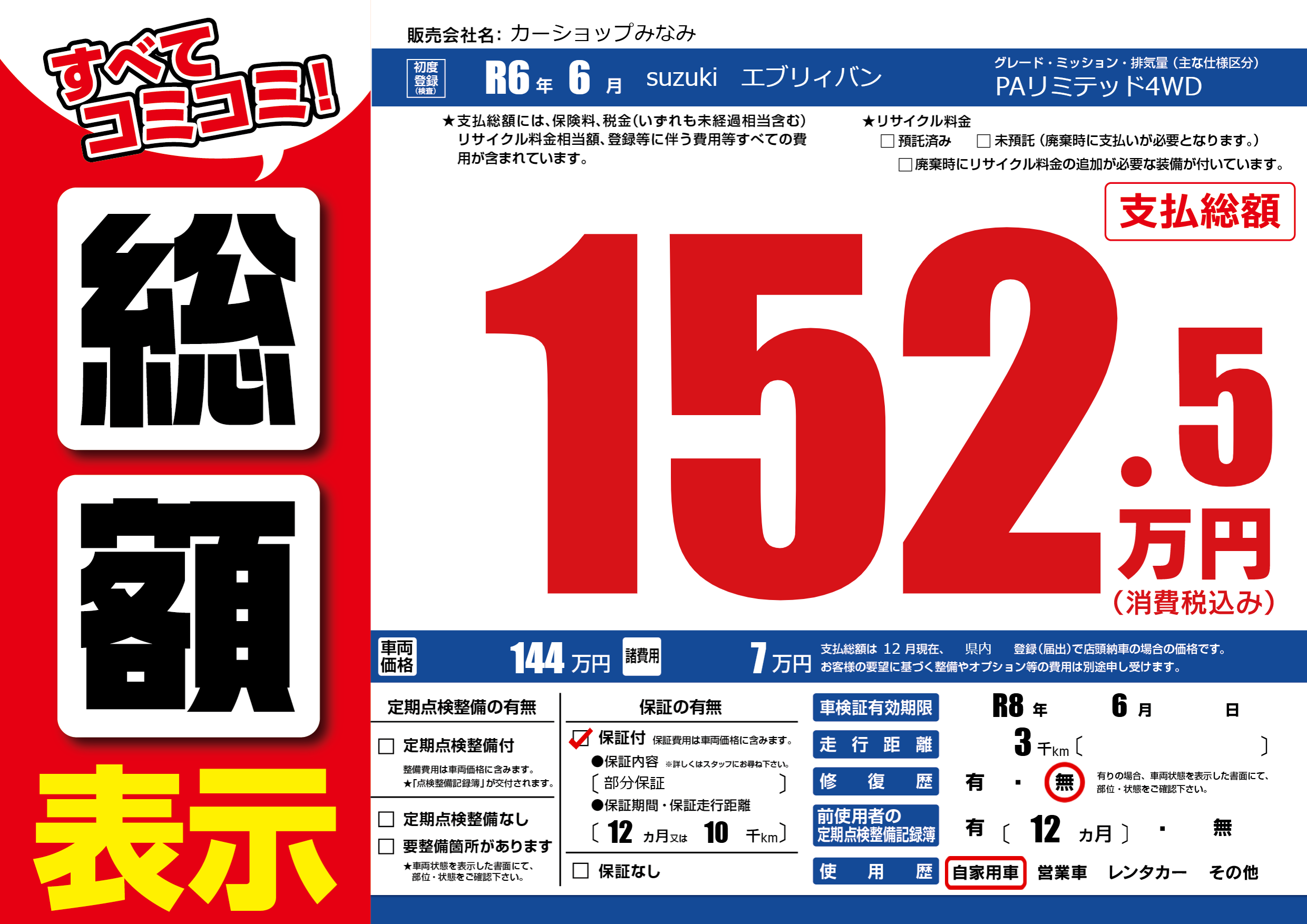 | 車名 | suzuki エブリィバン | グレード ミッション 排気量 |