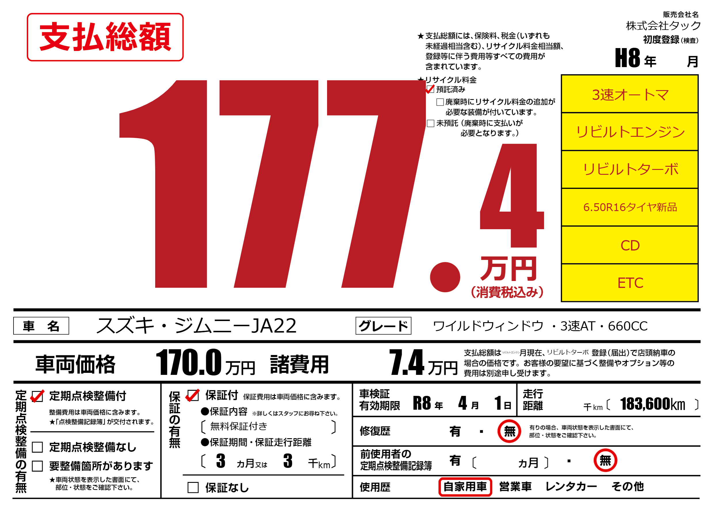 保証なし 保証内容(無料保証付き) 3ヶ月または(3)千kmまで |