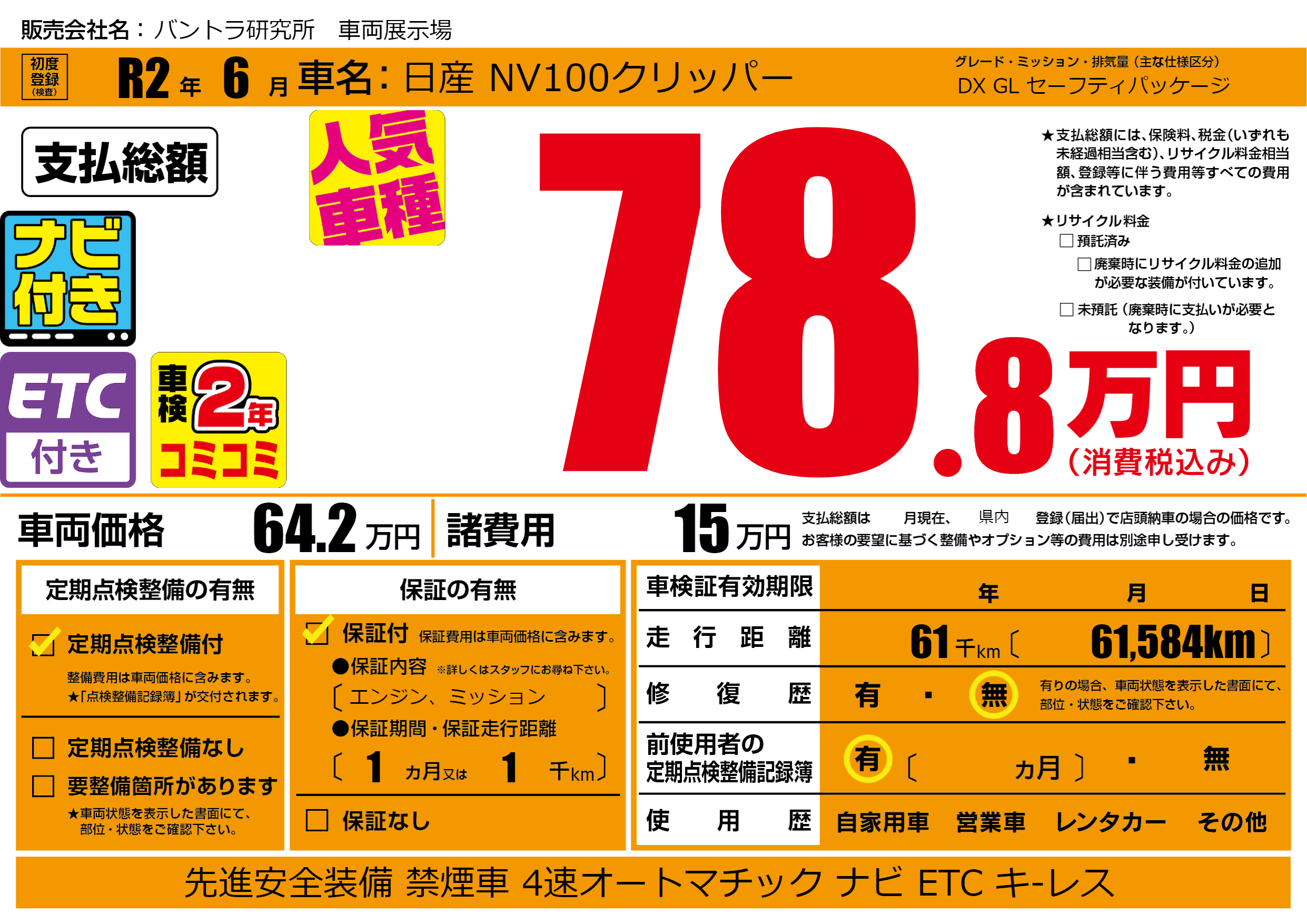 | 車名 | 日産 NV100クリッパー | グレード ミッション 排気量 |