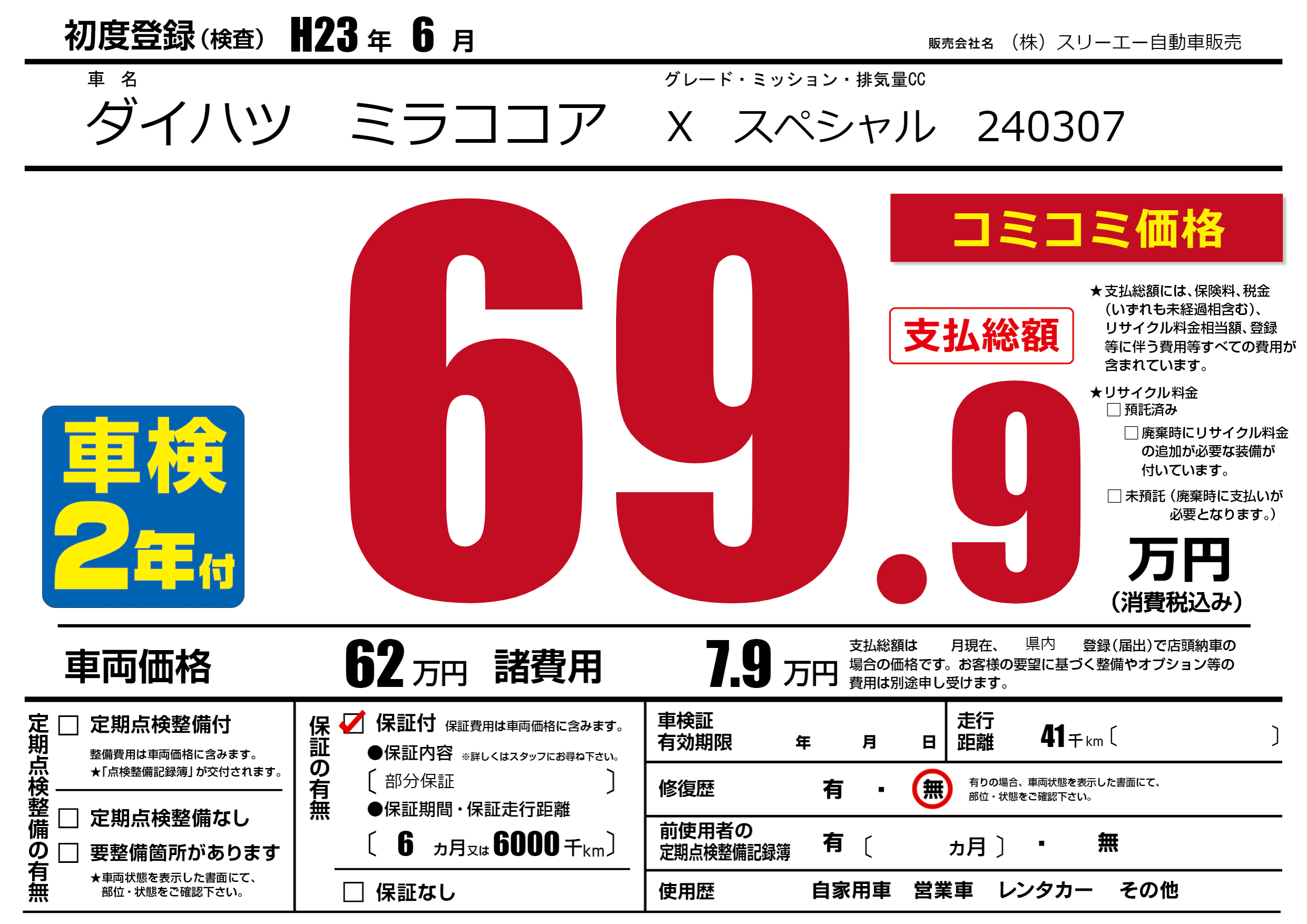 | 走行キロ | 4.1万km | 初年度登録 | H23年6月 |