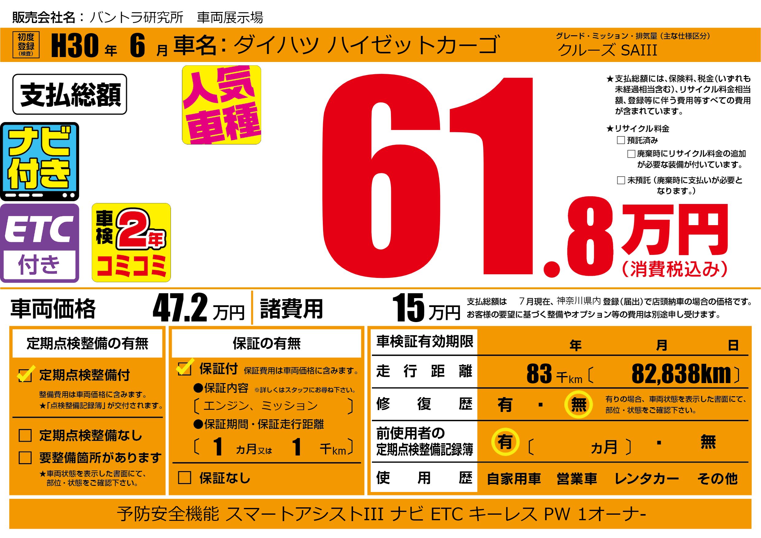 | 車名 | ダイハツ ハイゼットカーゴ | グレード ミッション 排気量 |