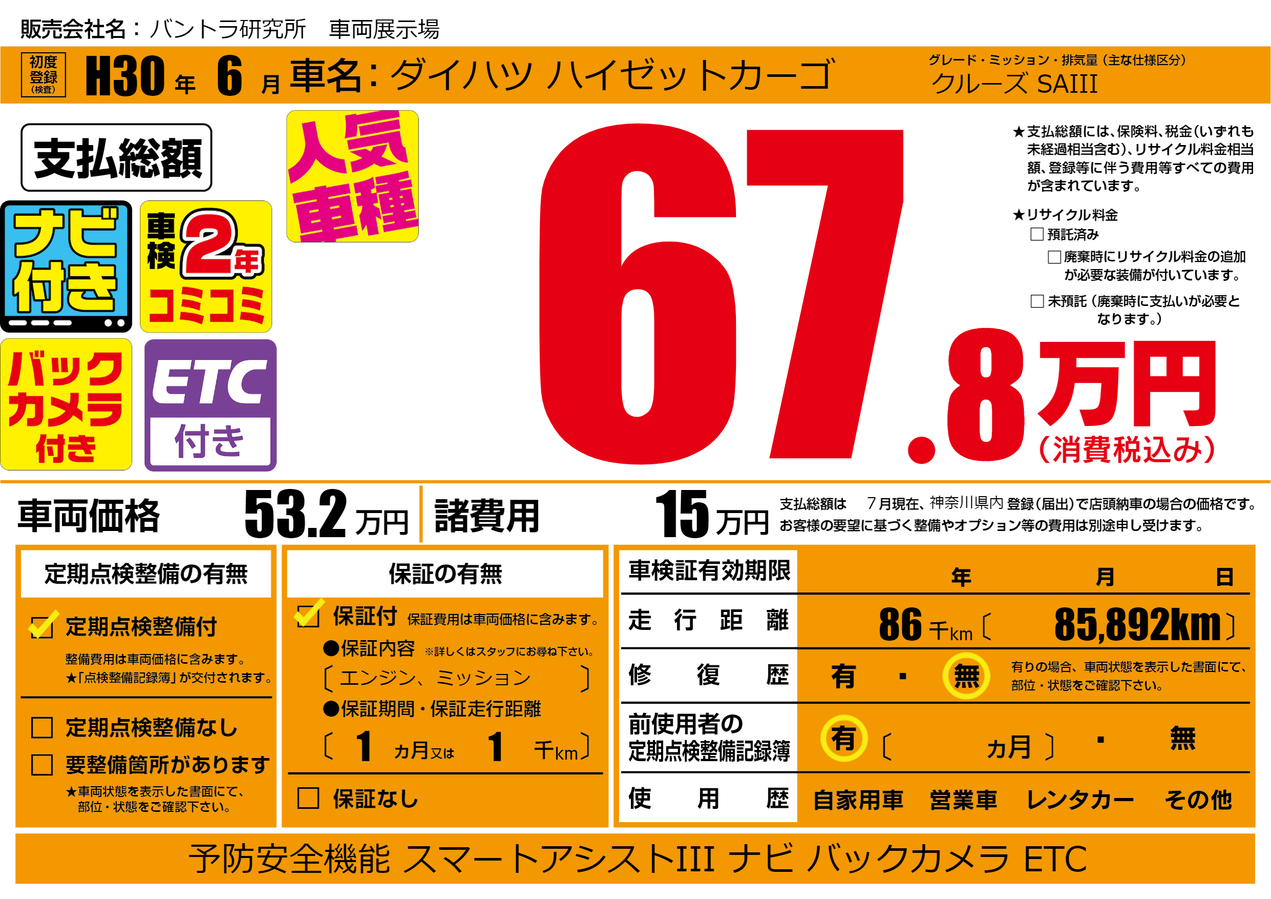 | 車名 | ダイハツ ハイゼットカーゴ | グレード ミッション 排気量 |