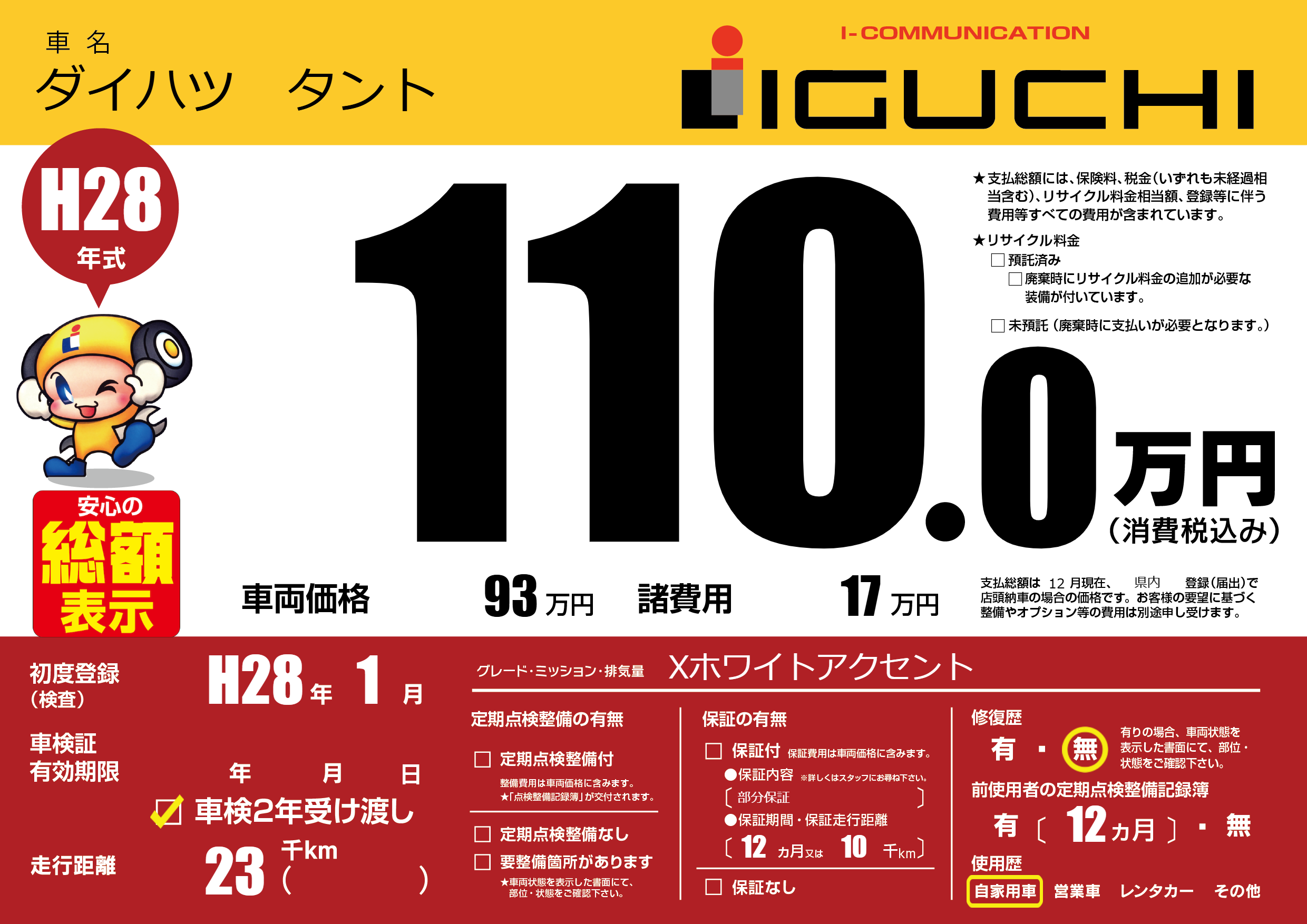 | 車名 | ダイハツ タント | グレード ミッション 排気量 |