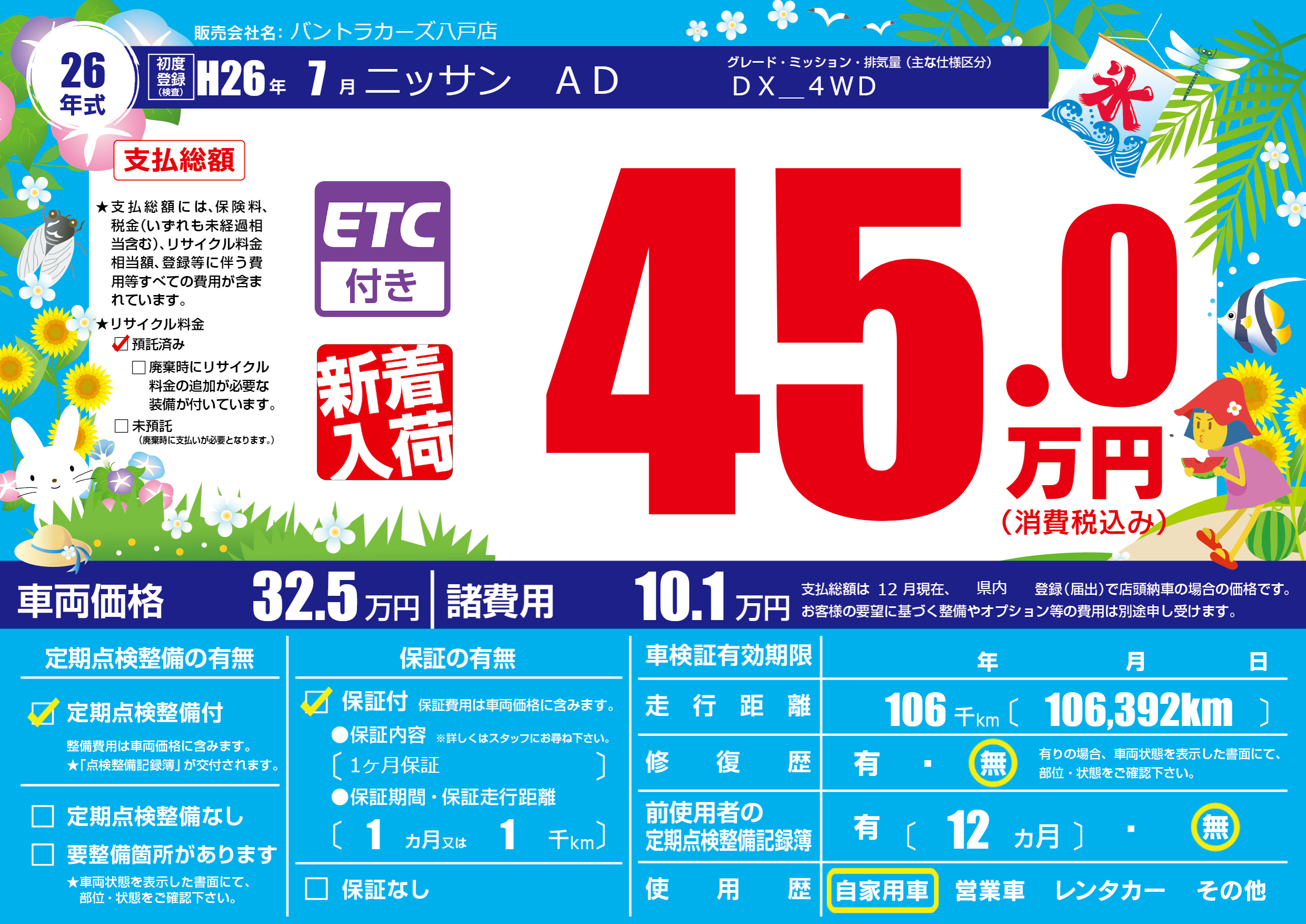 | 走行キロ | 10.6万km | 初年度登録 | H26年7月 |