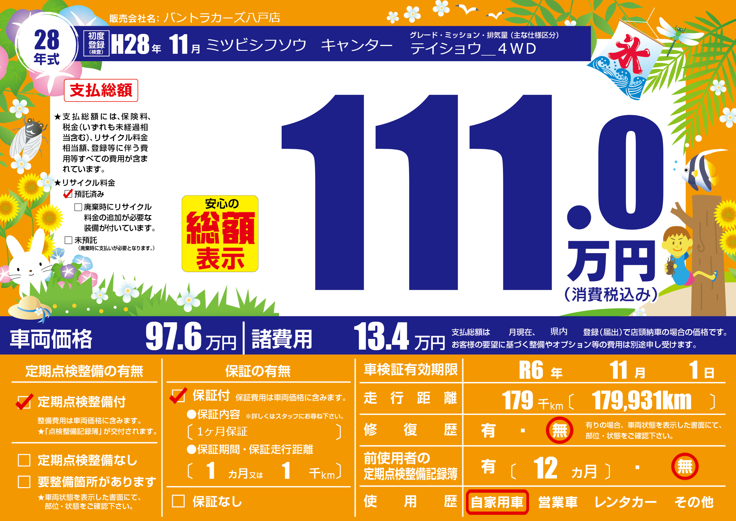 | 走行キロ | 17.9万km | 初年度登録 | H28年11月 |