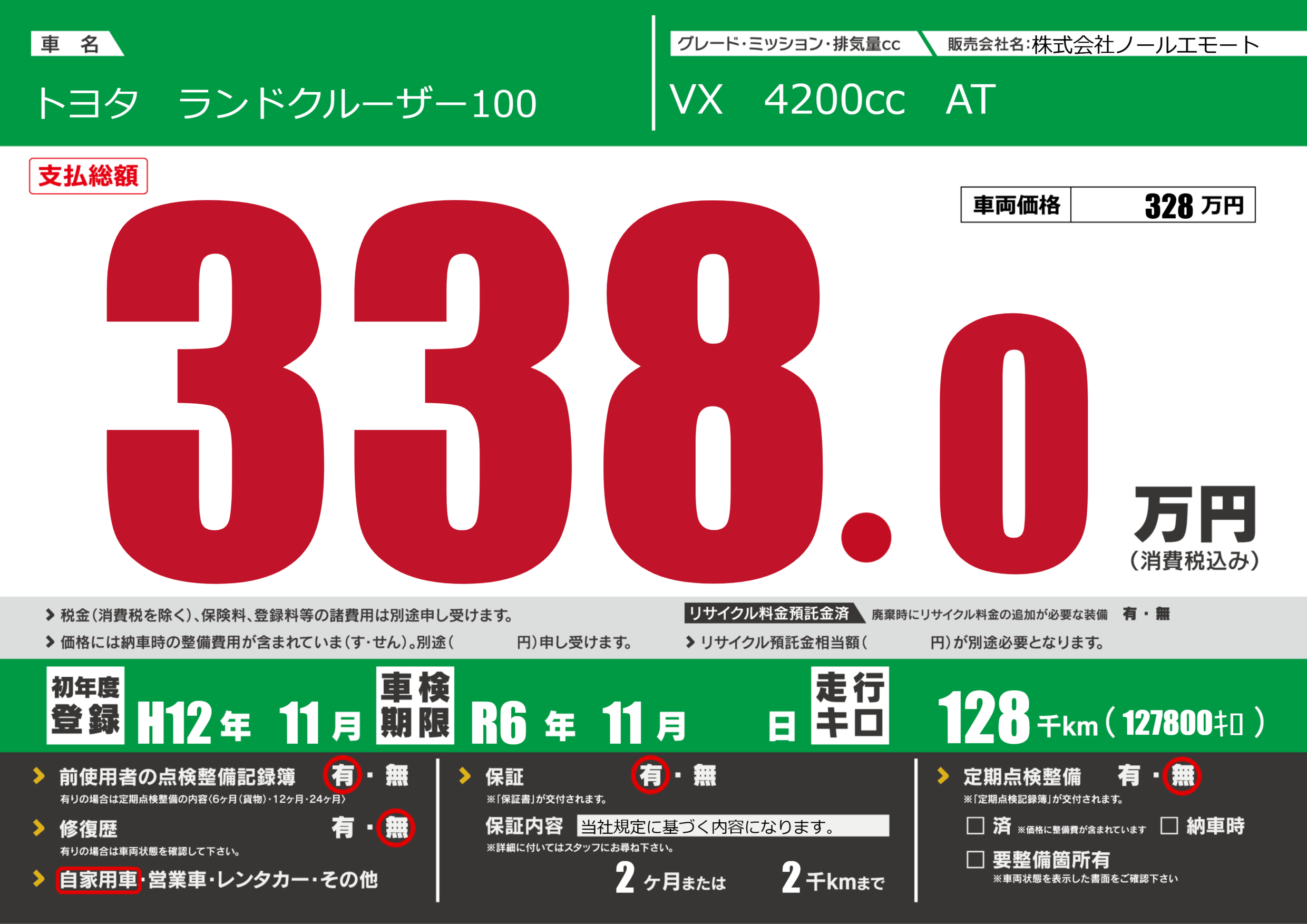 | 車名 | トヨタ ランドクルーザー100 | グレード ミッション 排気量 |