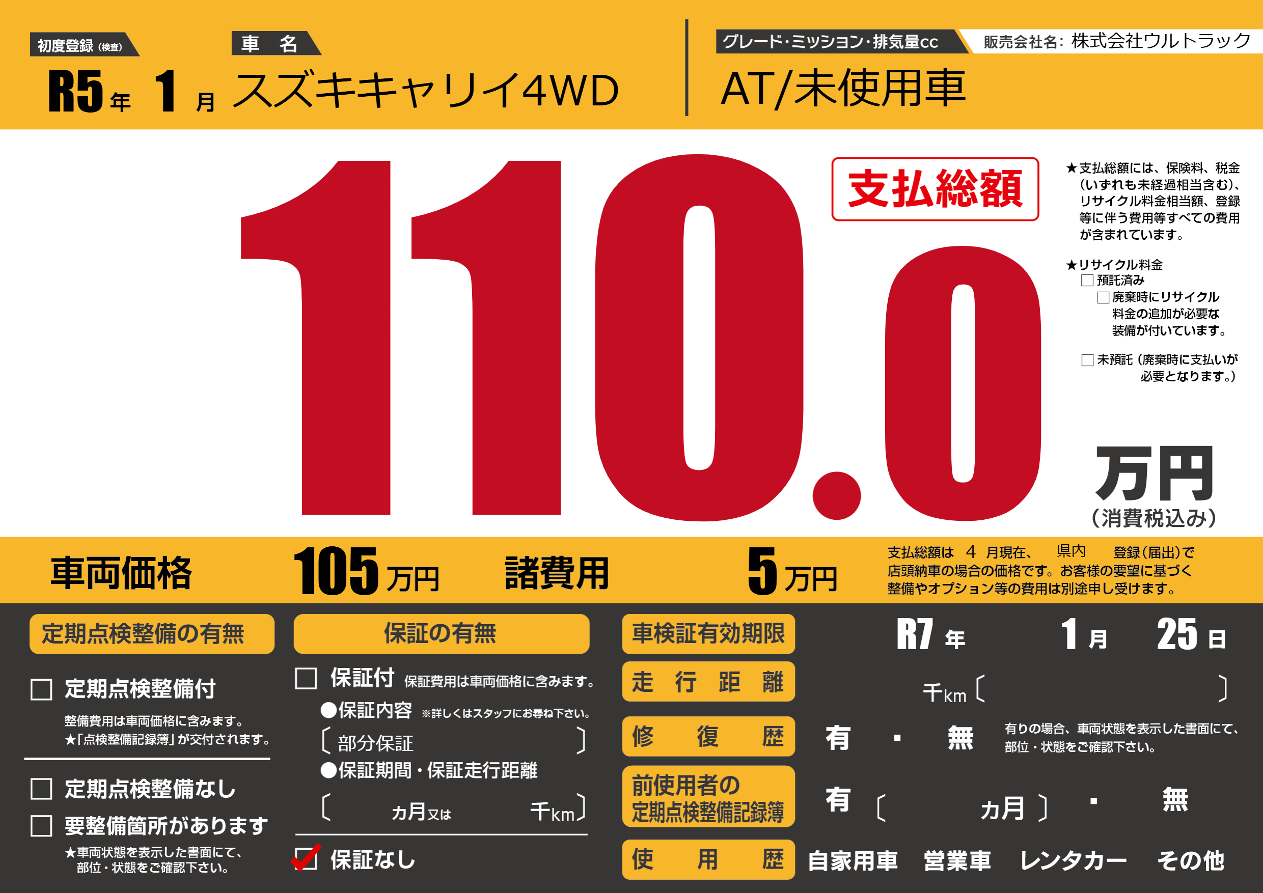 保証なし 保証内容(部分保証) ---ヶ月または()千kmまで |