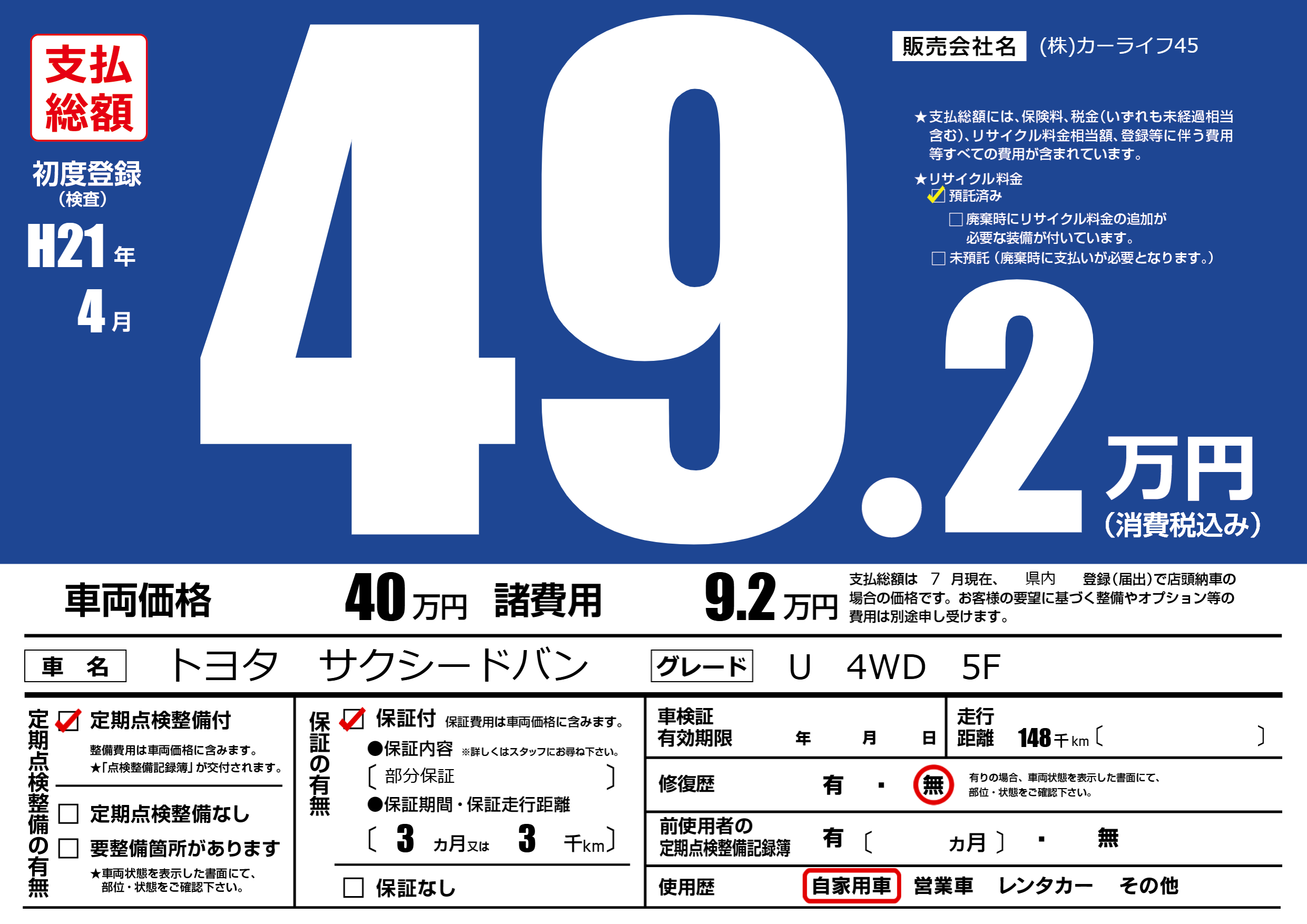 | 走行キロ | 14.8万km | 初年度登録 | H21年4月 |