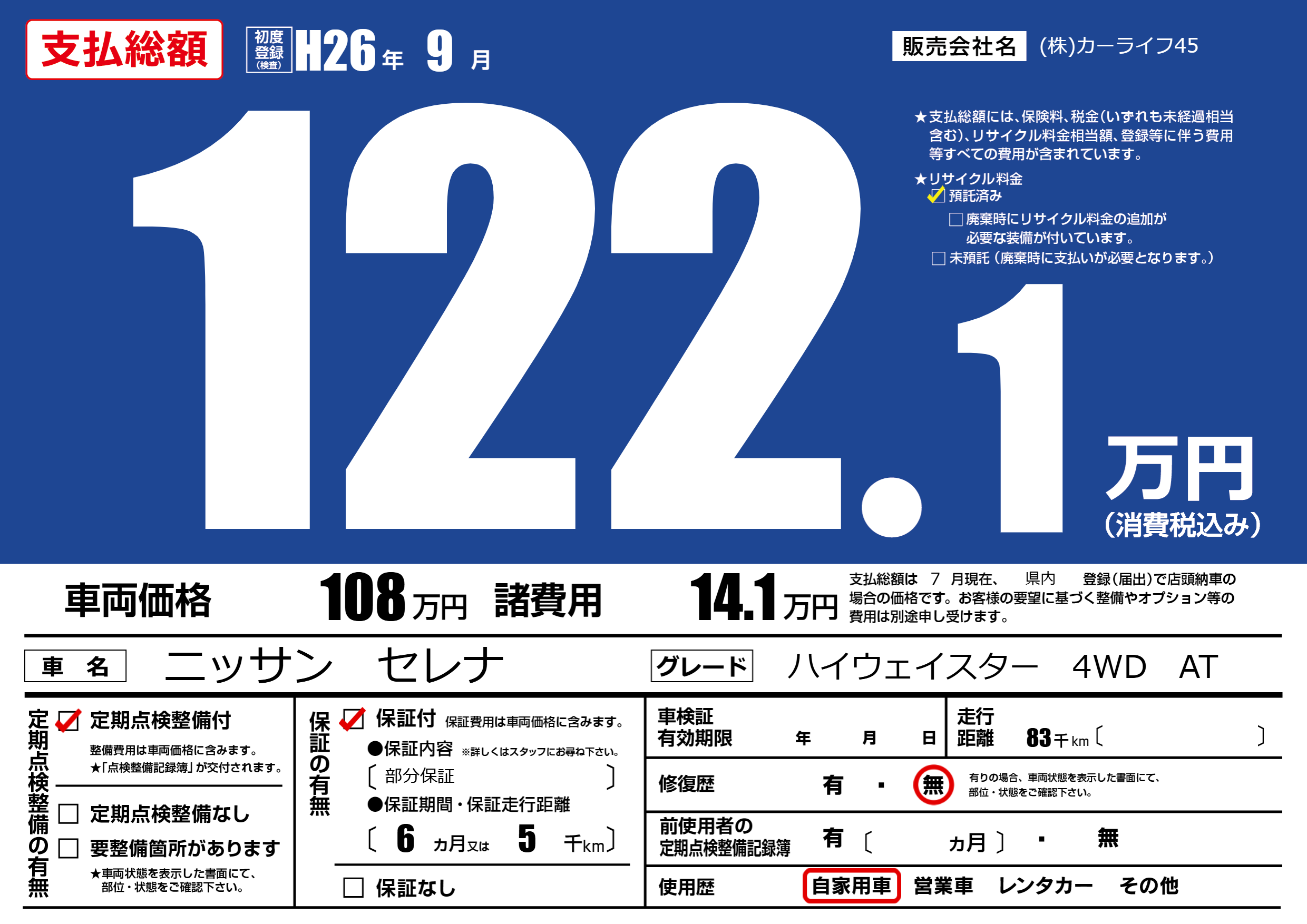 | 走行キロ | 8.3万km | 初年度登録 | H26年9月 |