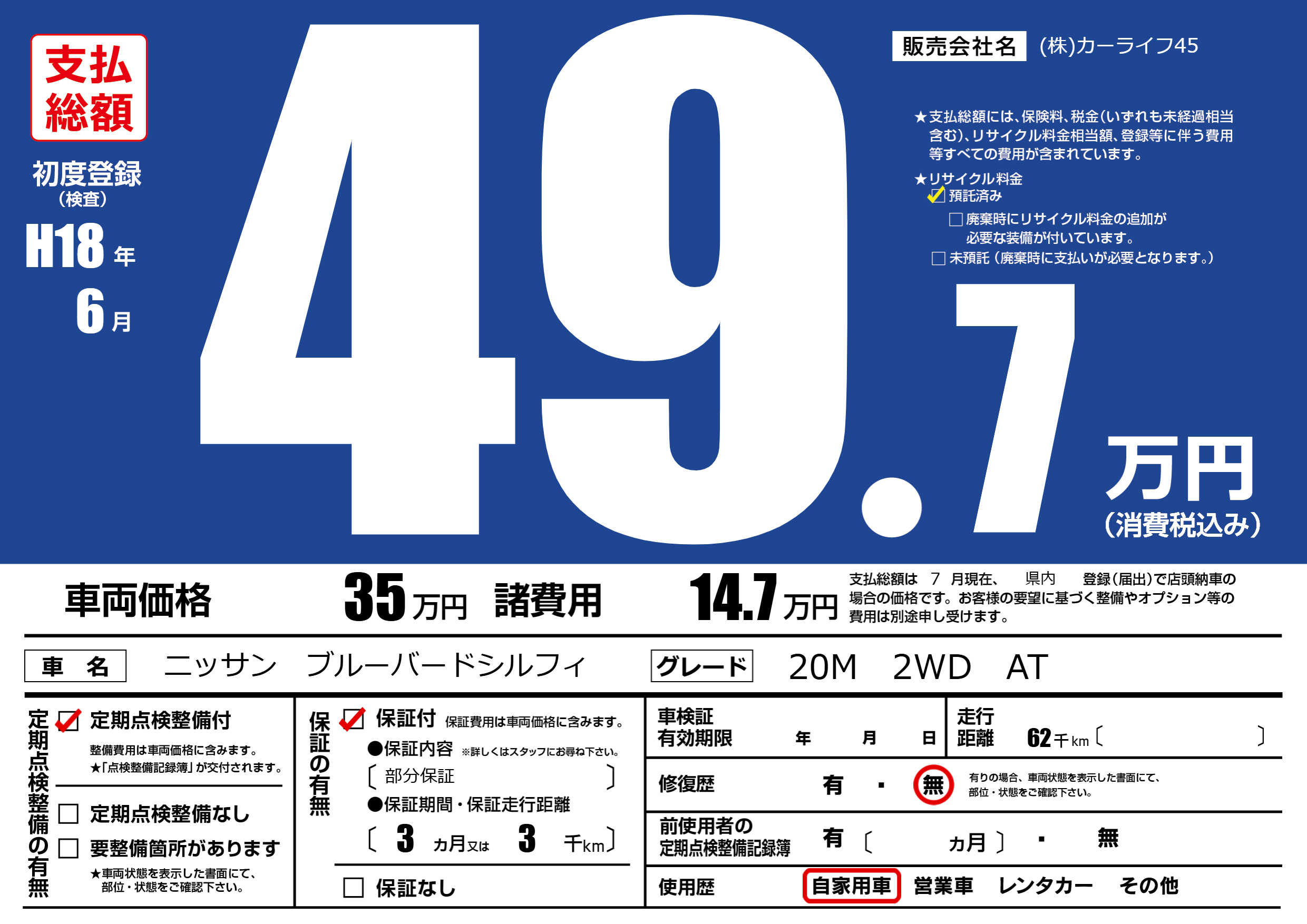 | 走行キロ | 6.2万km | 初年度登録 | H18年6月 |