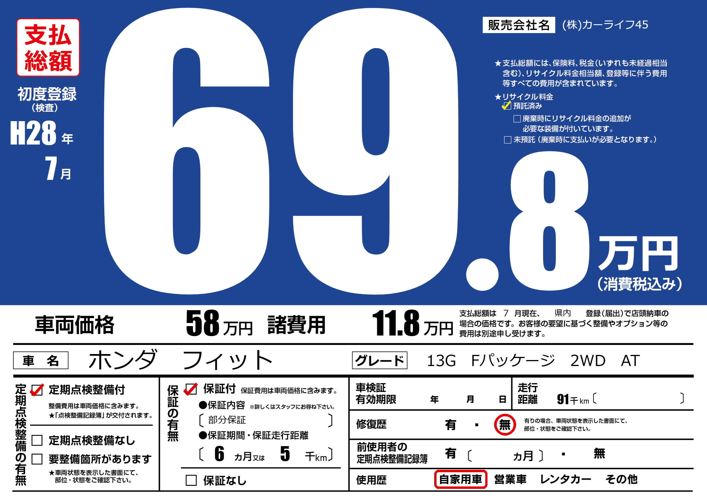 | 走行キロ | 9.1万km | 初年度登録 | H28年7月 |