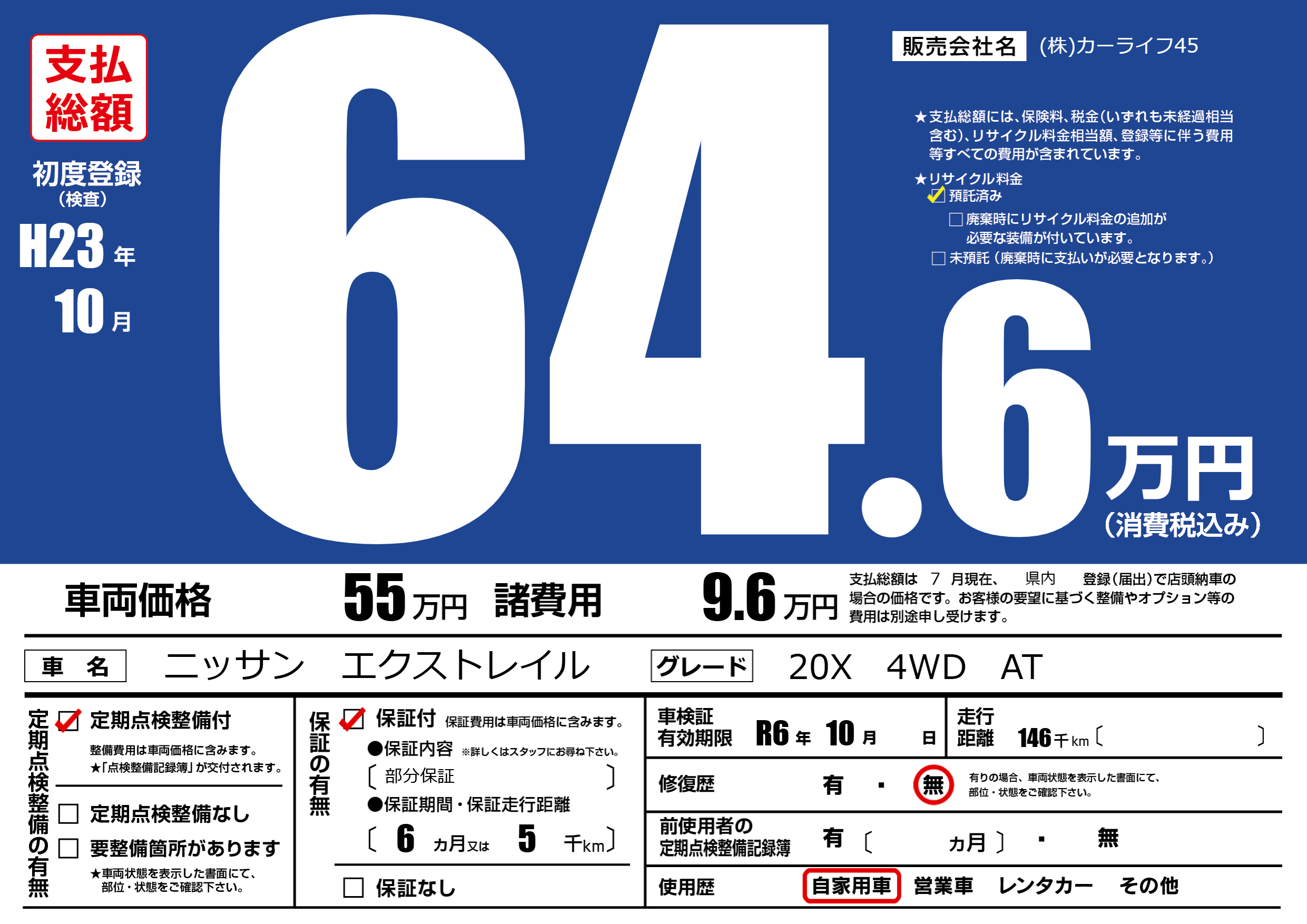 | 車検制限 | R6年 10月 - 日 | ||
