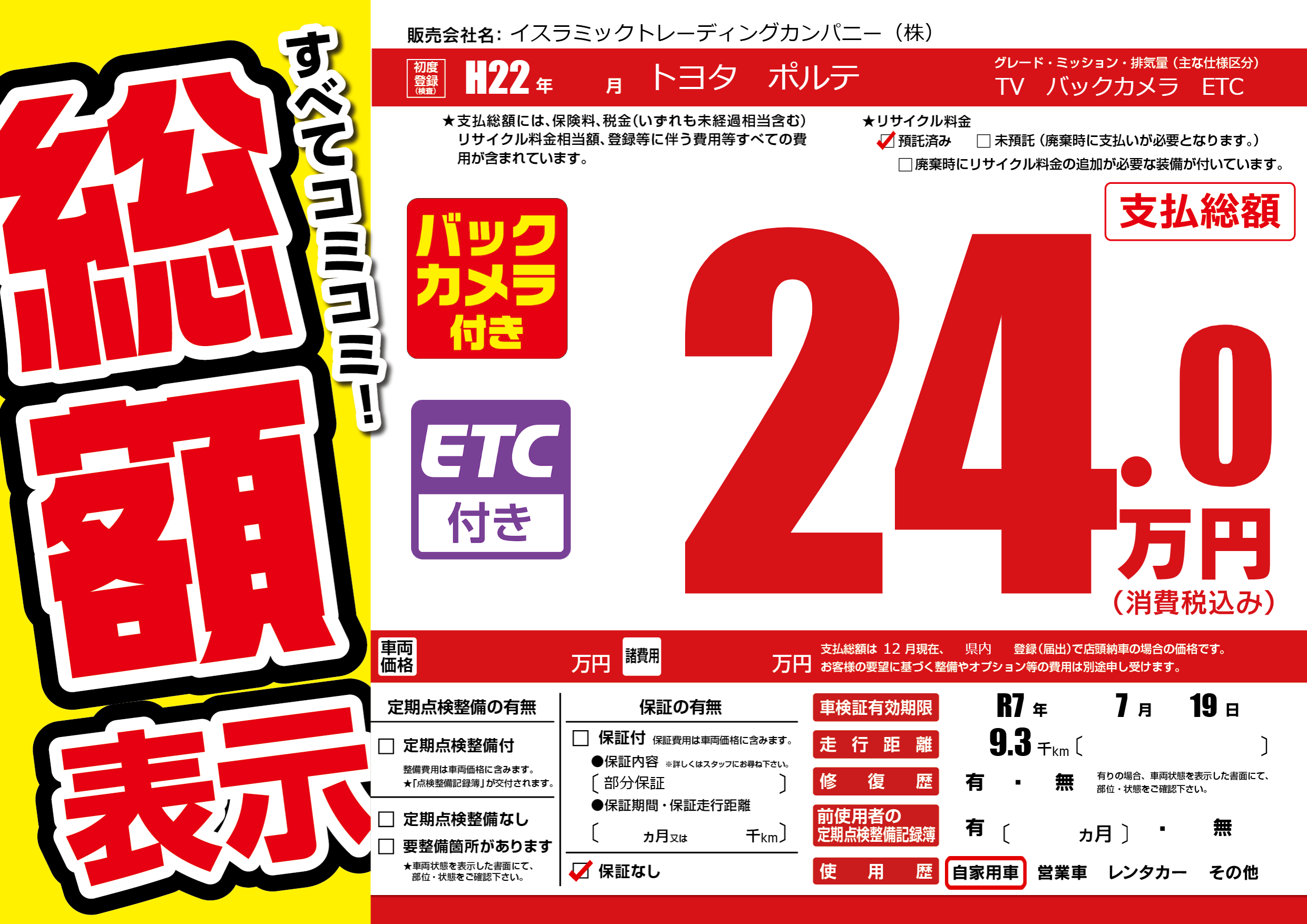 | 車名 | トヨタ ポルテ | グレード ミッション 排気量 |