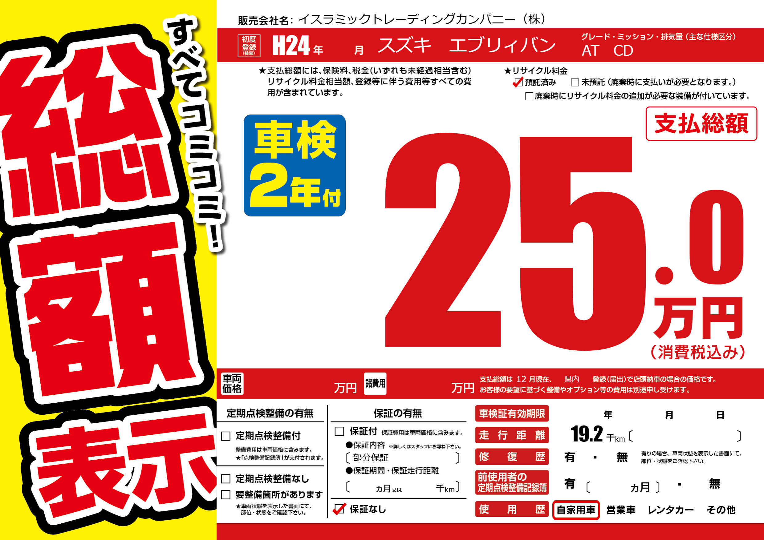 | 車名 | スズキ エブリィバン | グレード ミッション 排気量 |