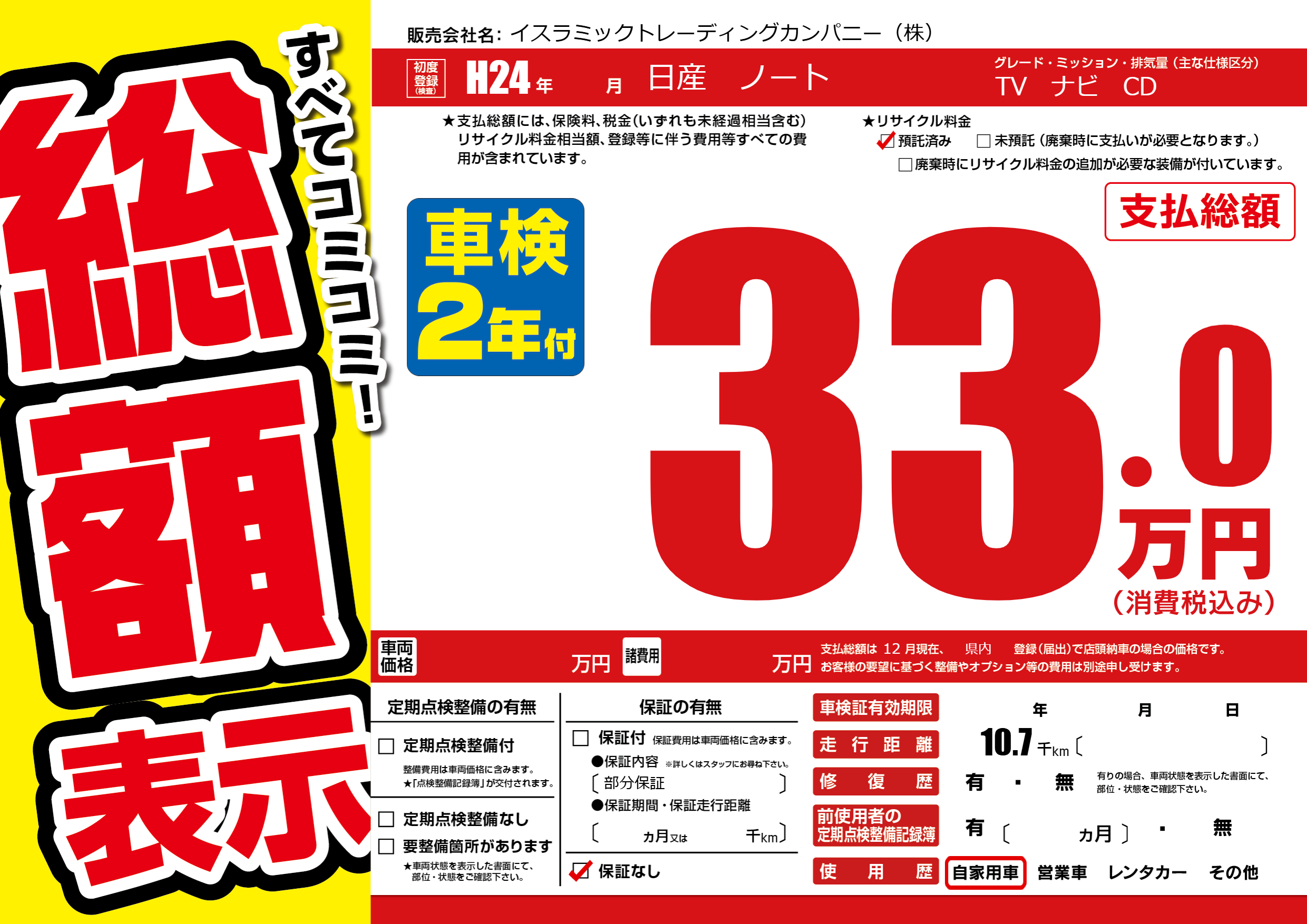 | 車名 | 日産 ノート | グレード ミッション 排気量 |