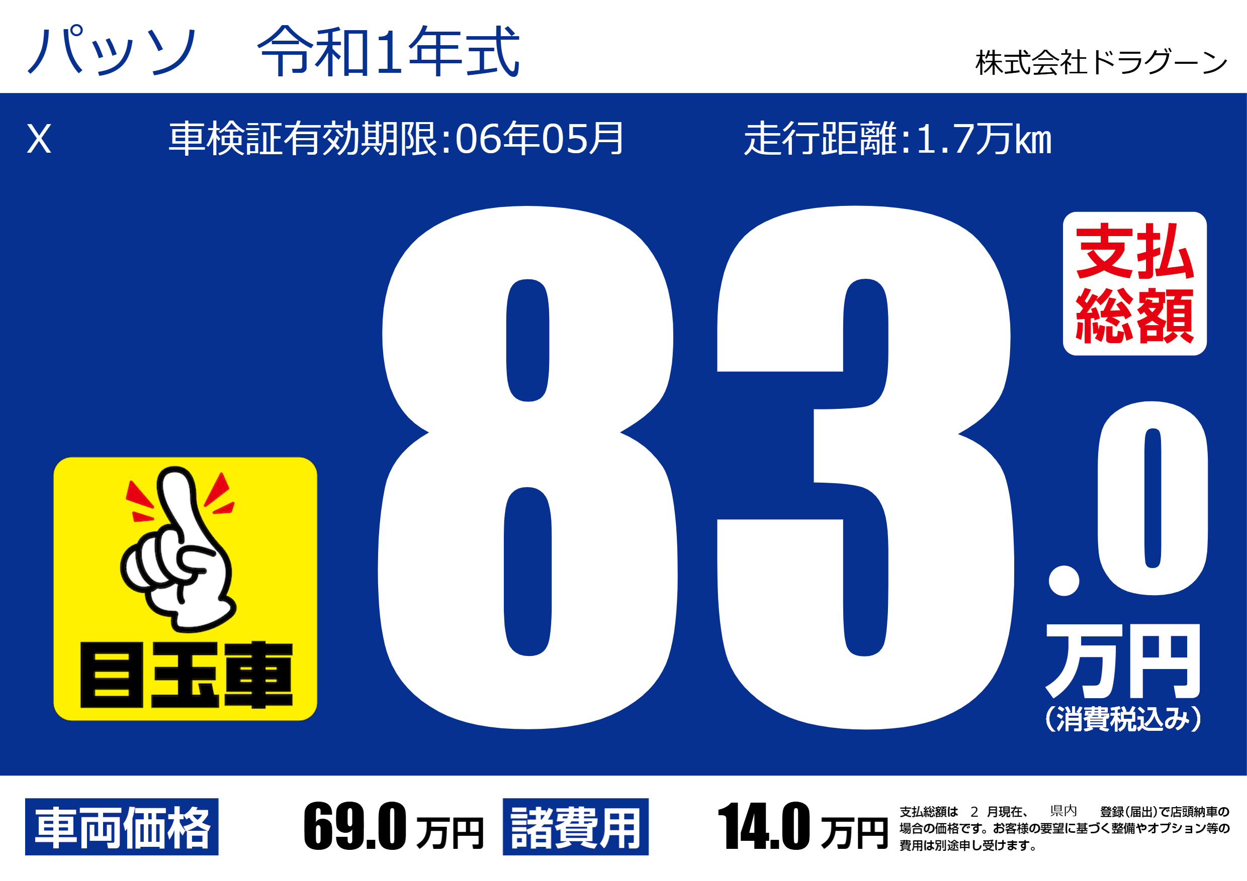 | 車名 | パッソ 令和1年式 | グレード ミッション 排気量 |