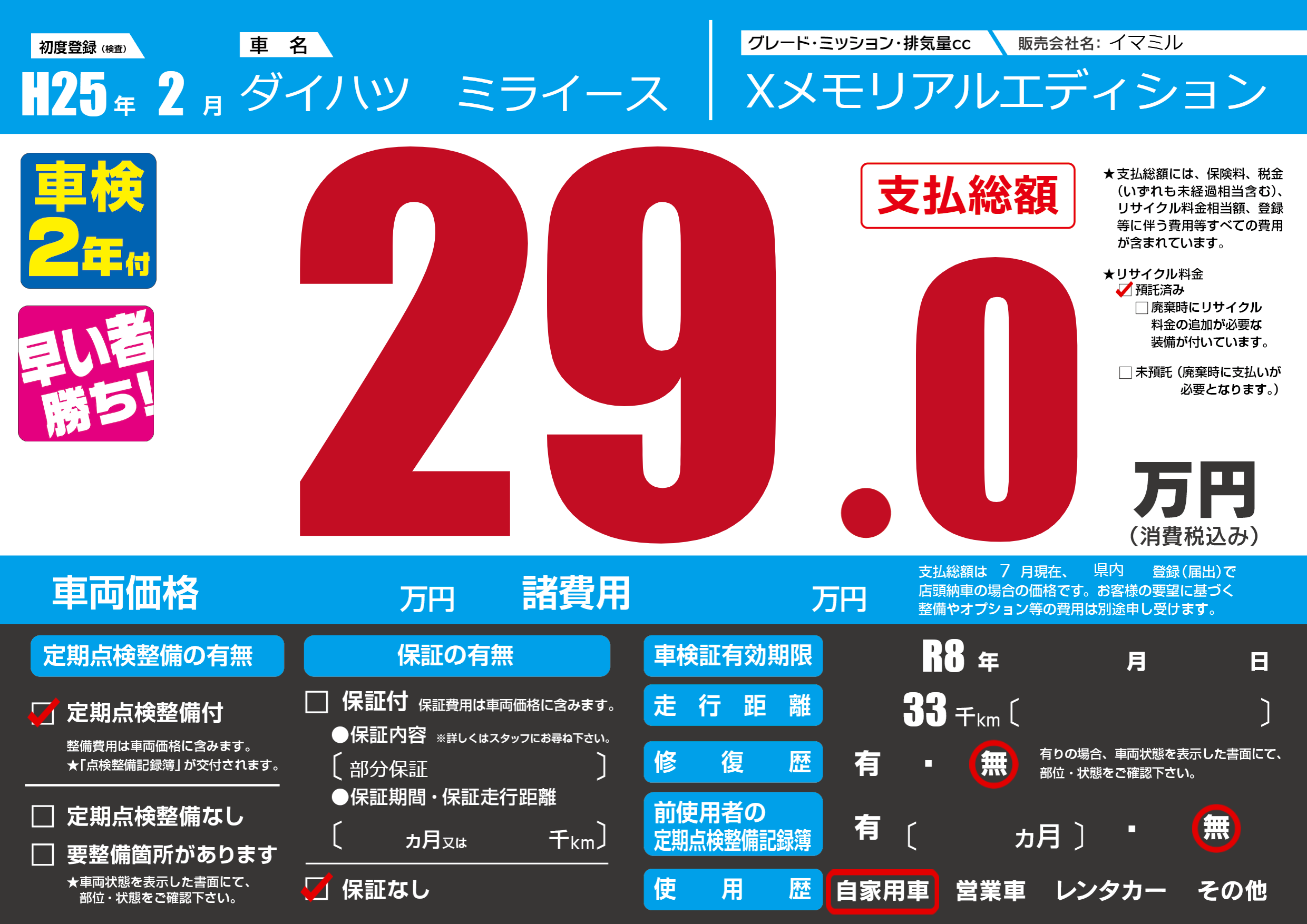 | 走行キロ | 3.3万km | 初年度登録 | H25年2月 |