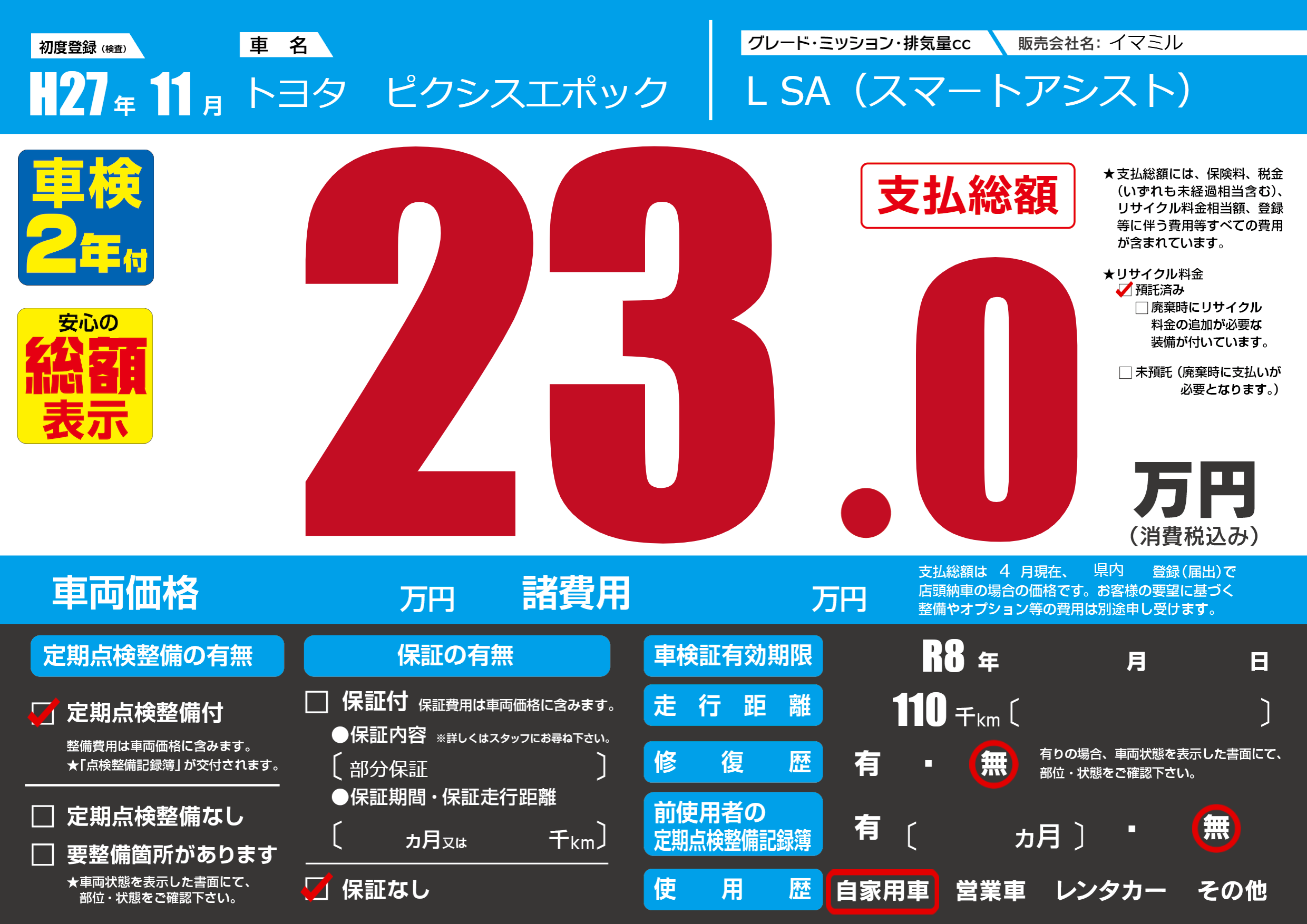 | 走行キロ | 11万km | 初年度登録 | H27年11月 |