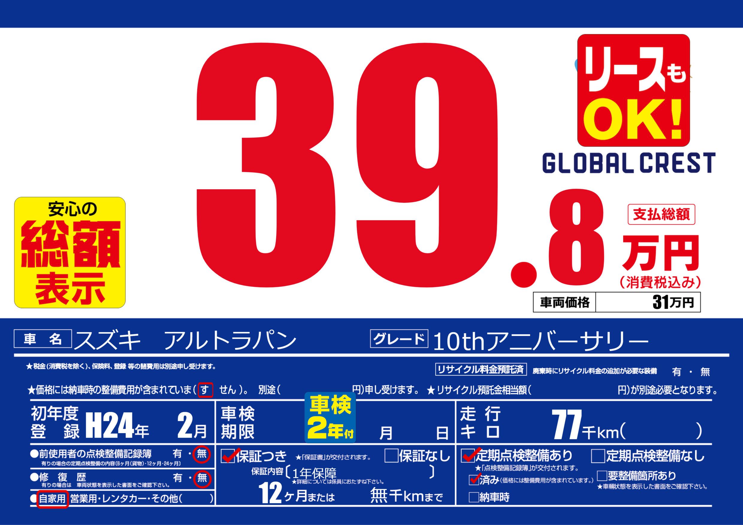 | 定期点検整備 | 定期点検整備あり 定期点検整備済み | ||