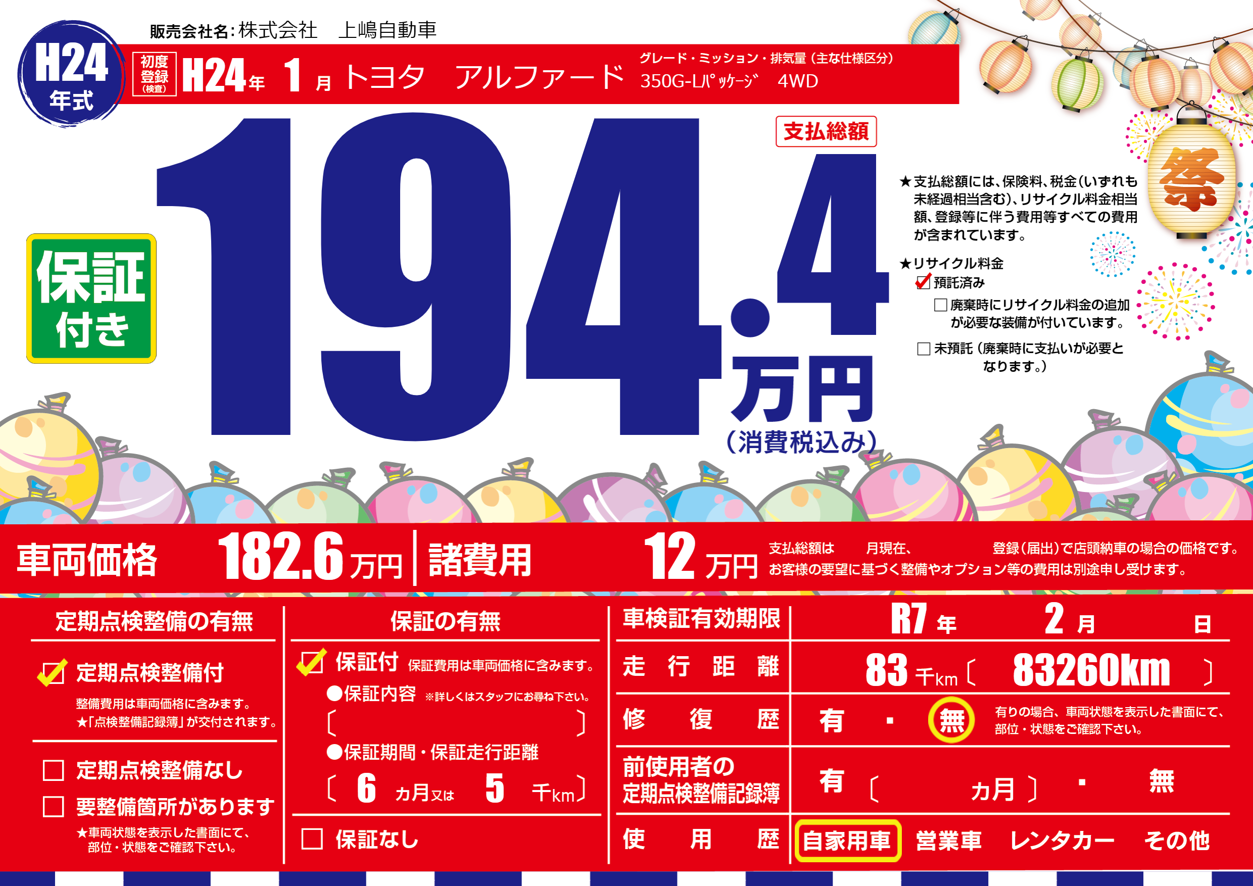 | 車検制限 | R7年 2月 - 日 | ||