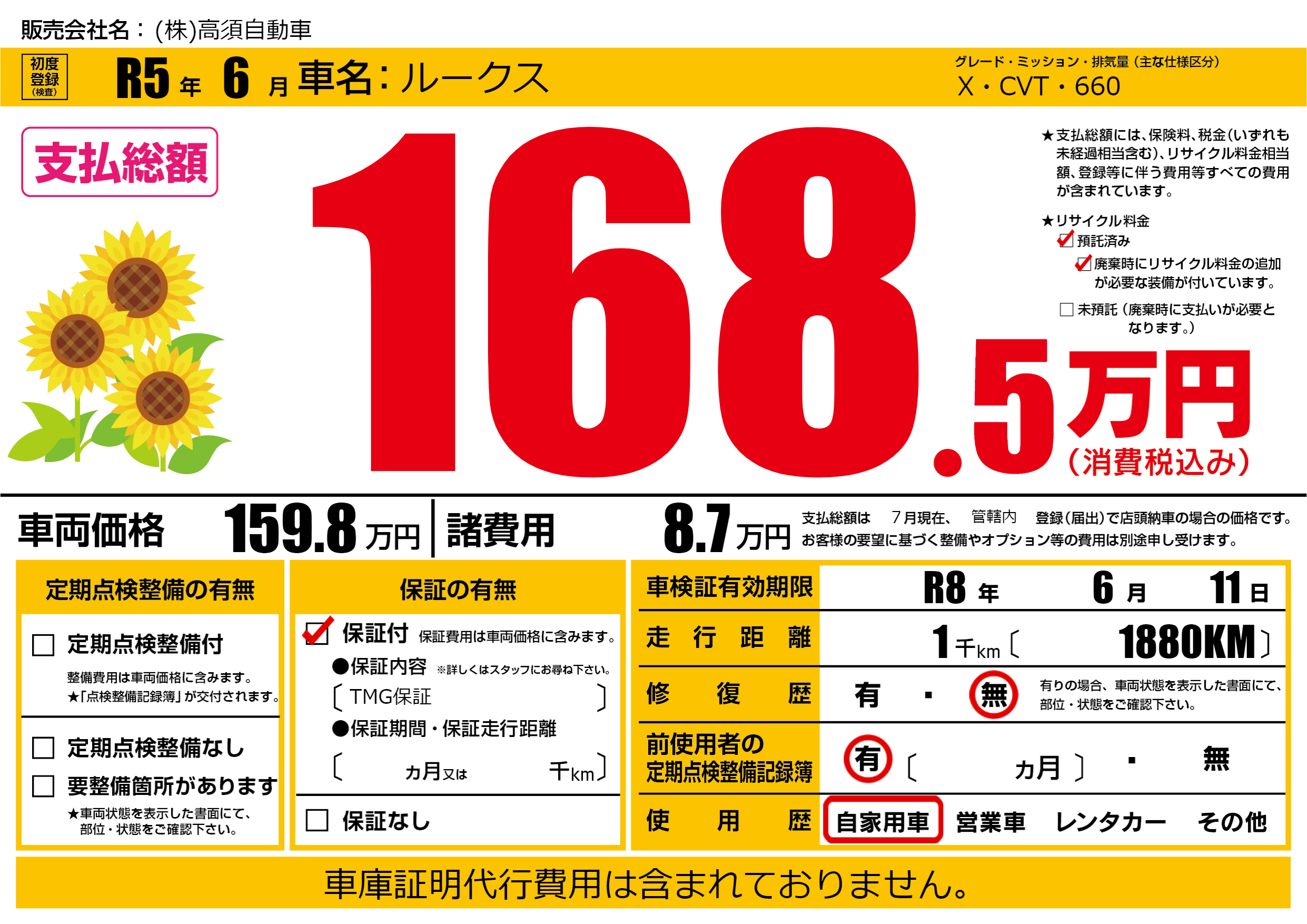 | 走行キロ | 0.1万km | 初年度登録 | R5年6月 |