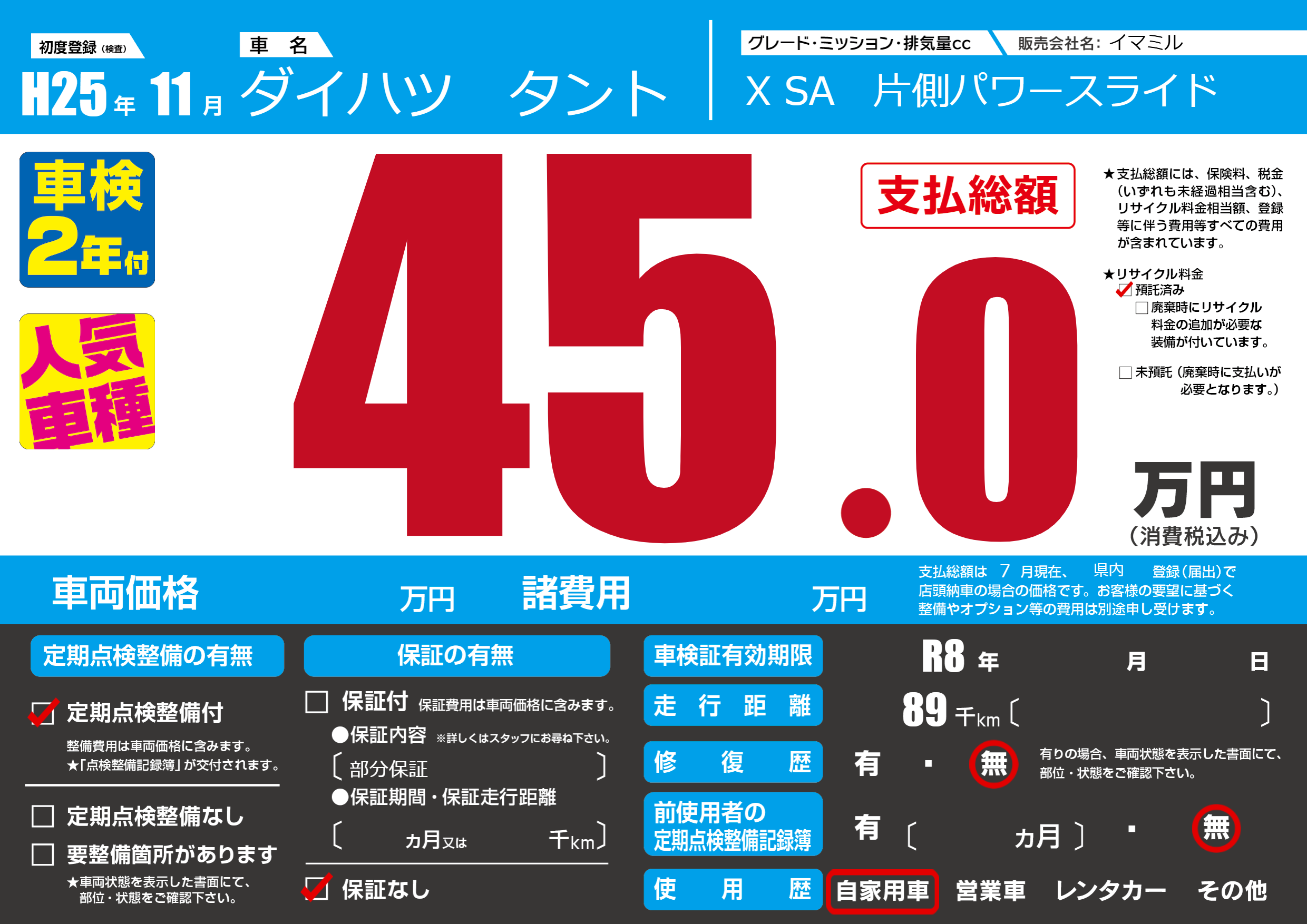 | 走行キロ | 8.9万km | 初年度登録 | H25年11月 |