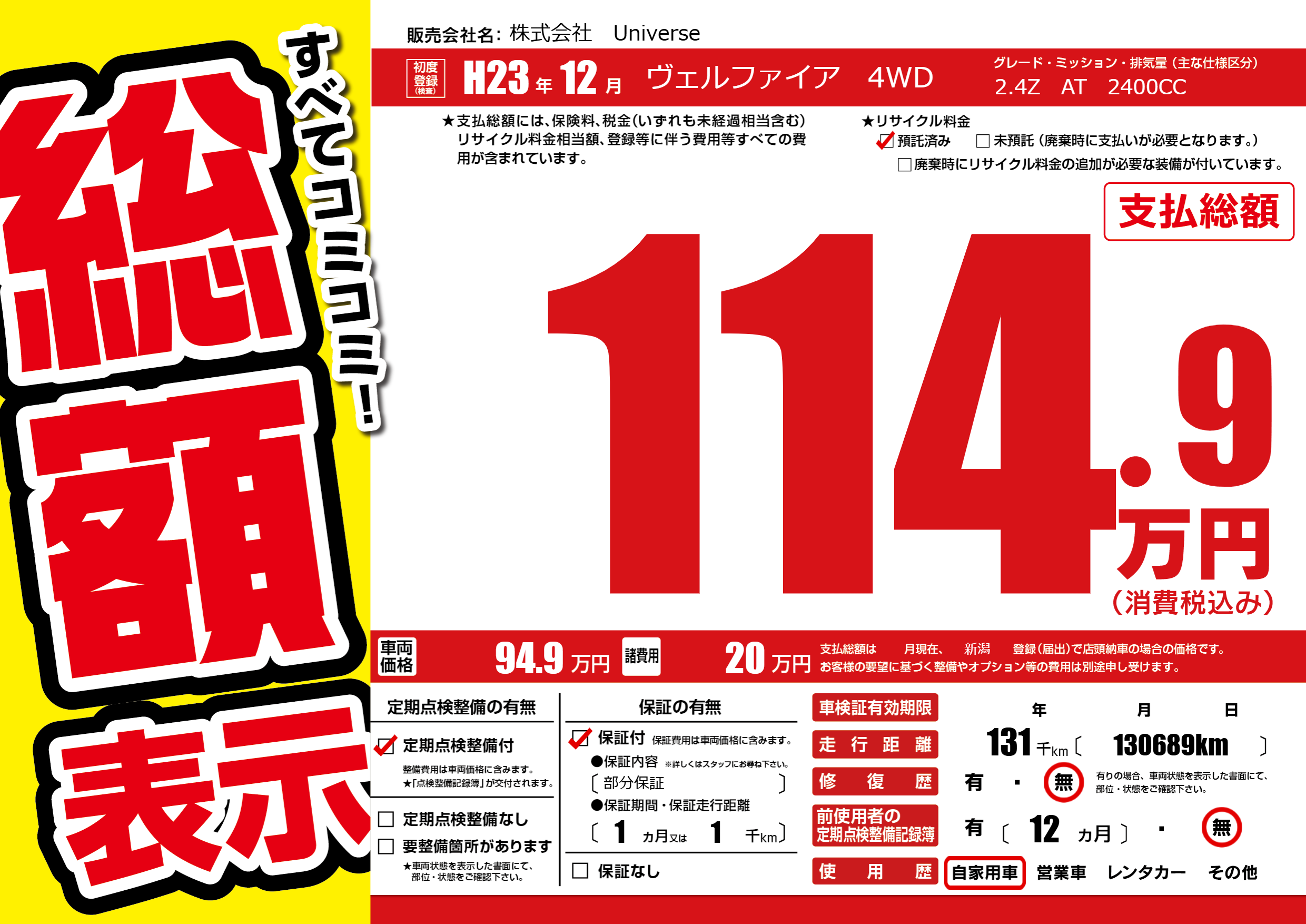 | 車名 | ヴェルファイア 4WD | グレード ミッション 排気量 |