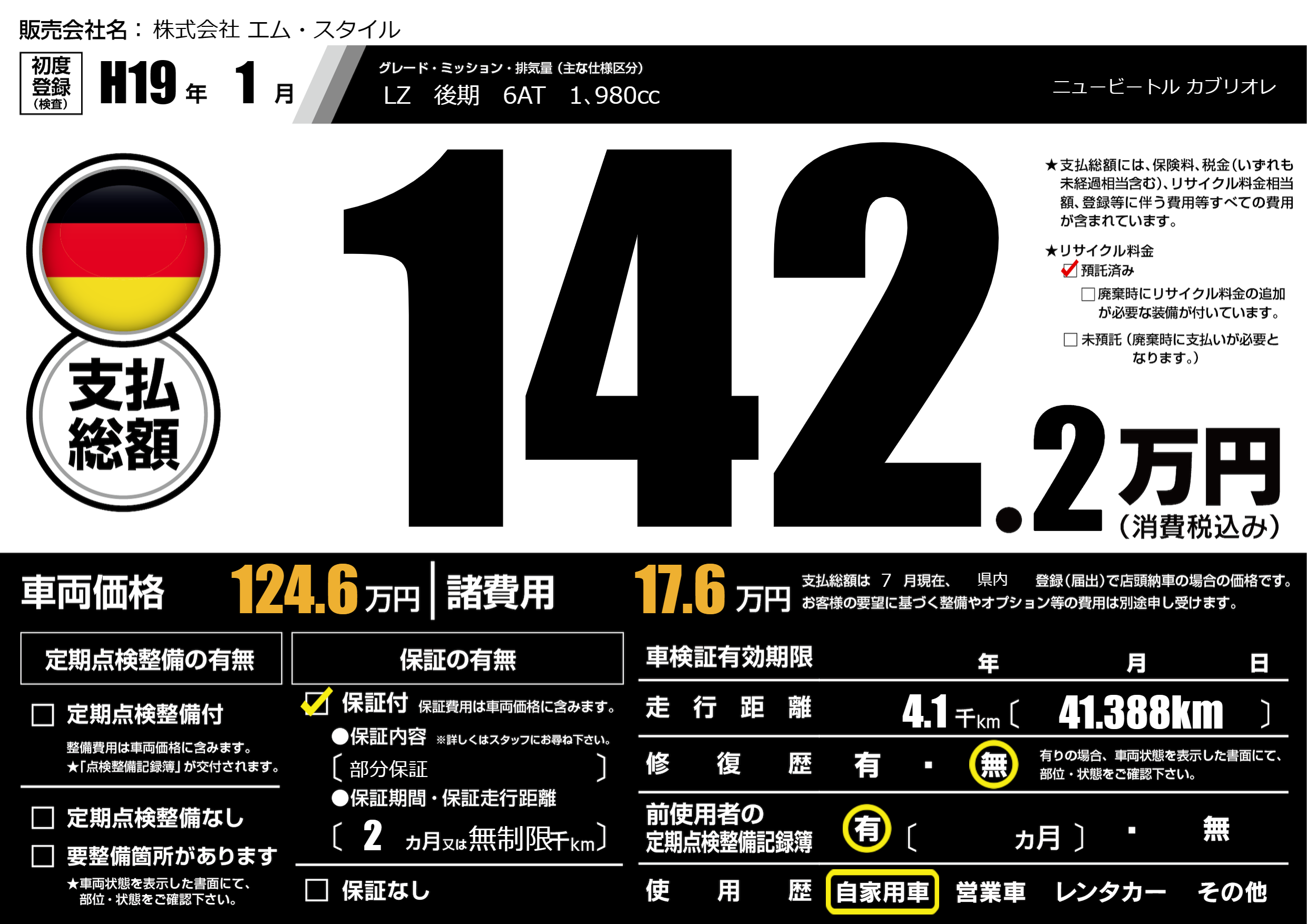 | 車名 | ニュービートル カブリオレ | グレード ミッション 排気量 |