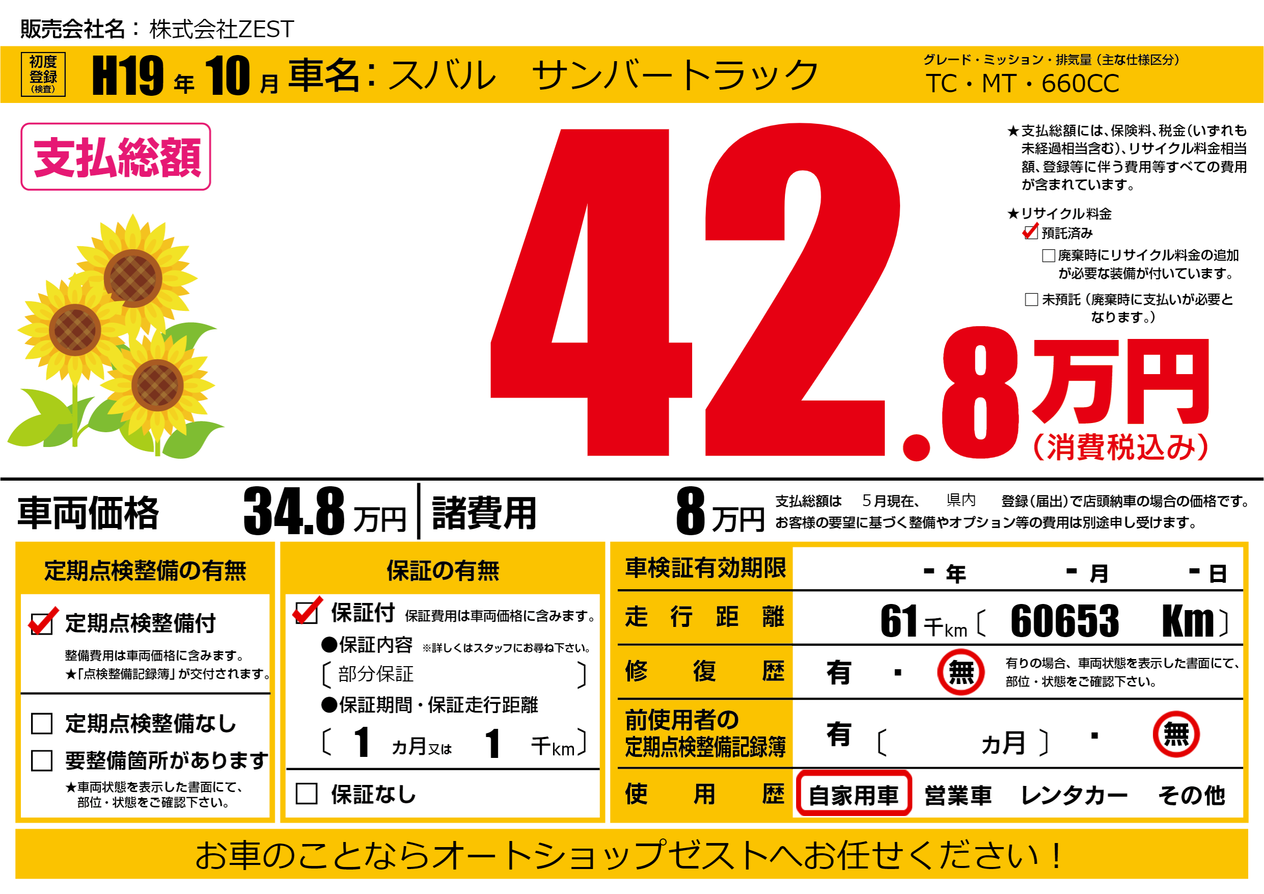 | 車名 | スバル サンバートラック | グレード ミッション 排気量 |