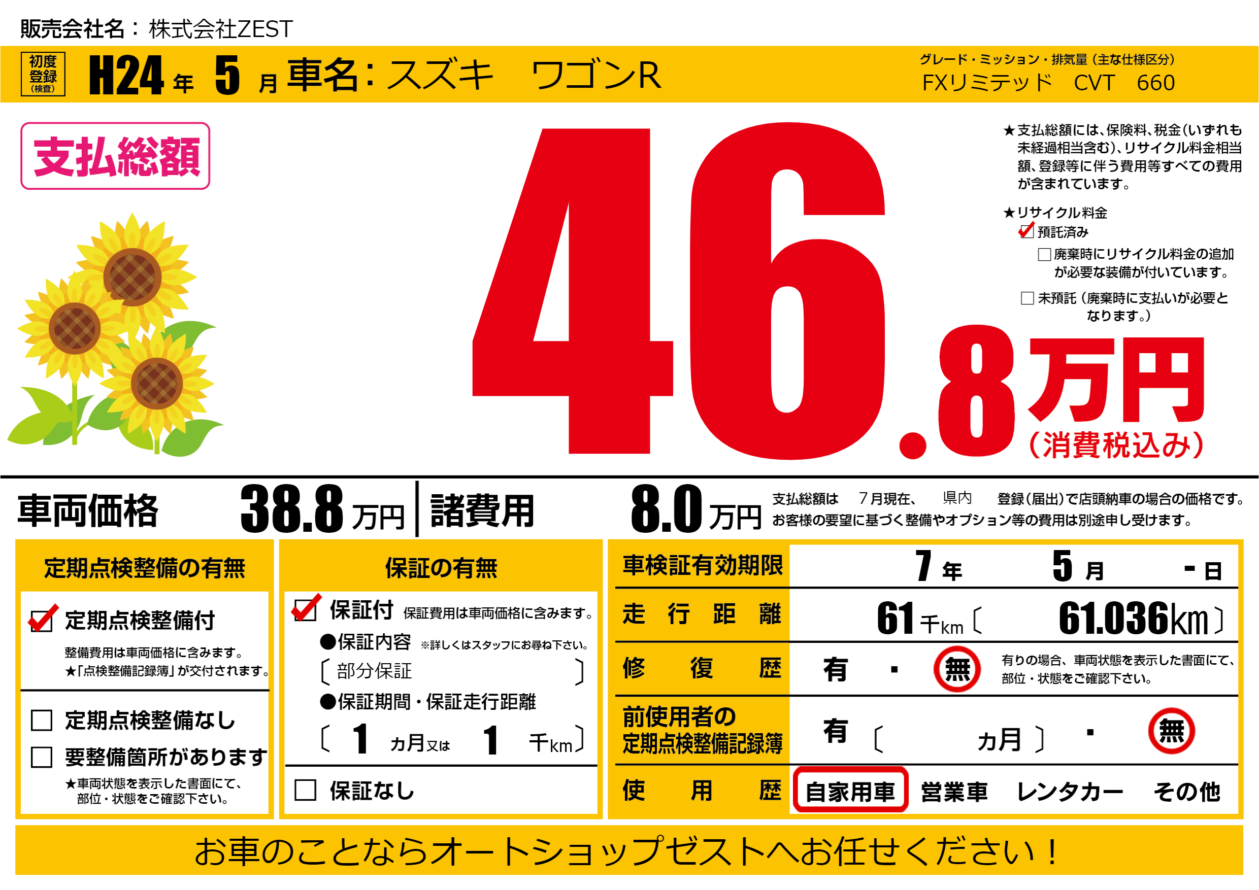 | 車名 | スズキ ワゴンR | グレード ミッション 排気量 |