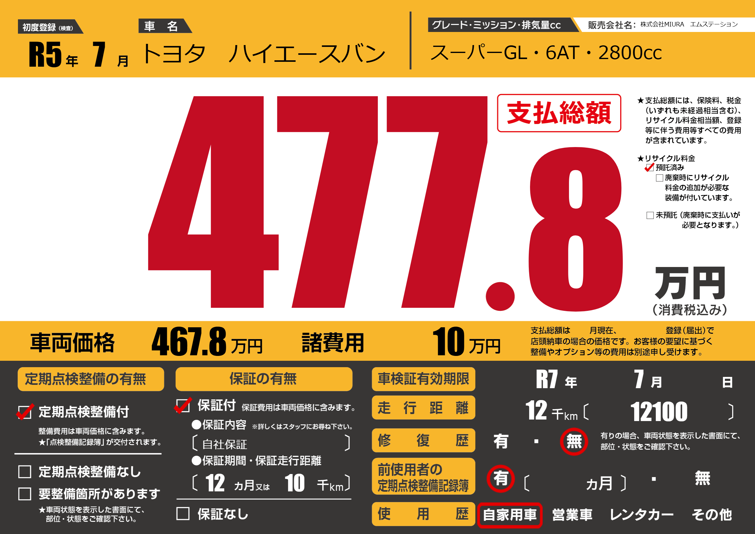 保証付き 保証内容(自社保証) 12ヶ月または(10)千kmまで |