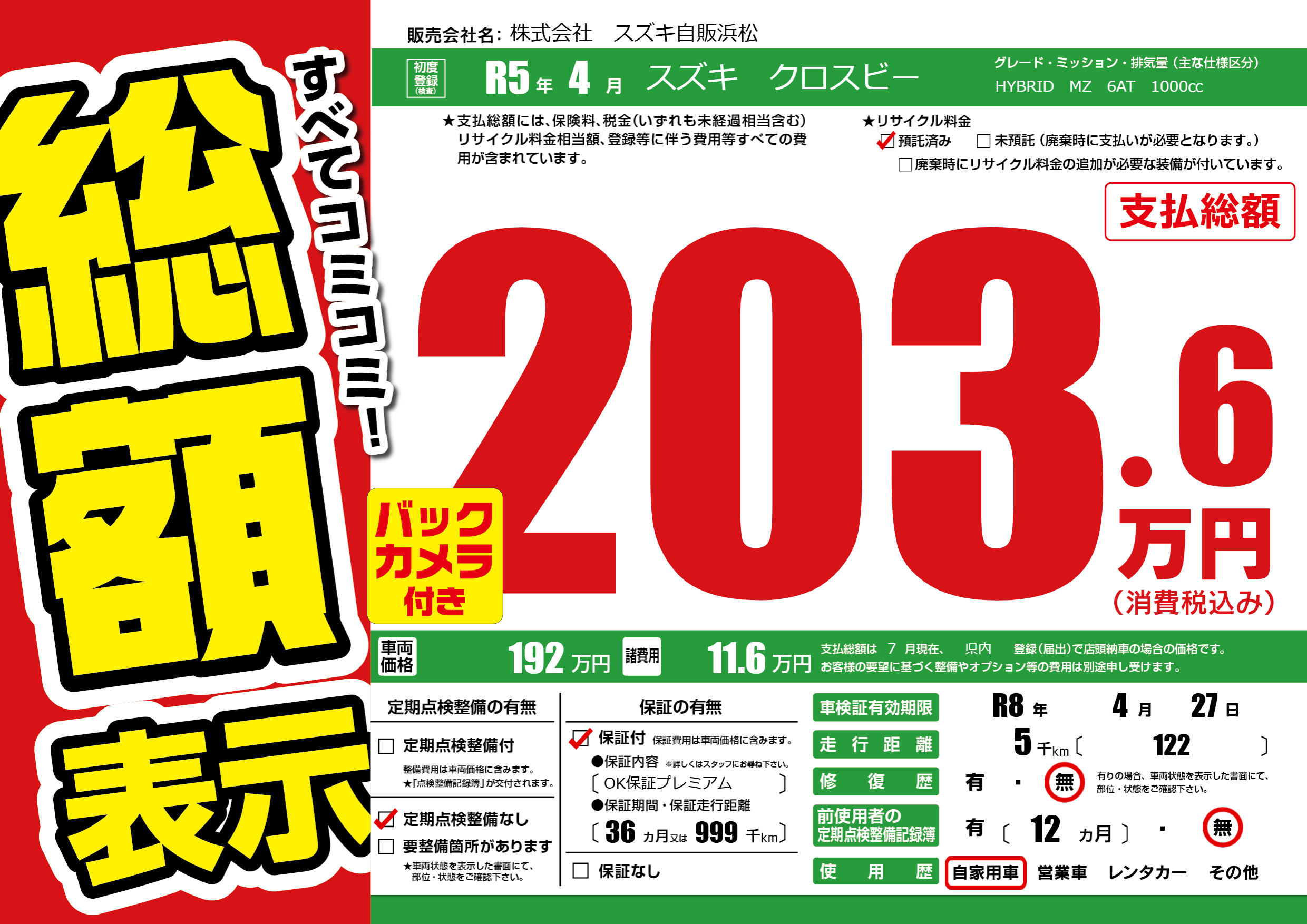 | 走行キロ | 0.5万km | 初年度登録 | R5年4月 |