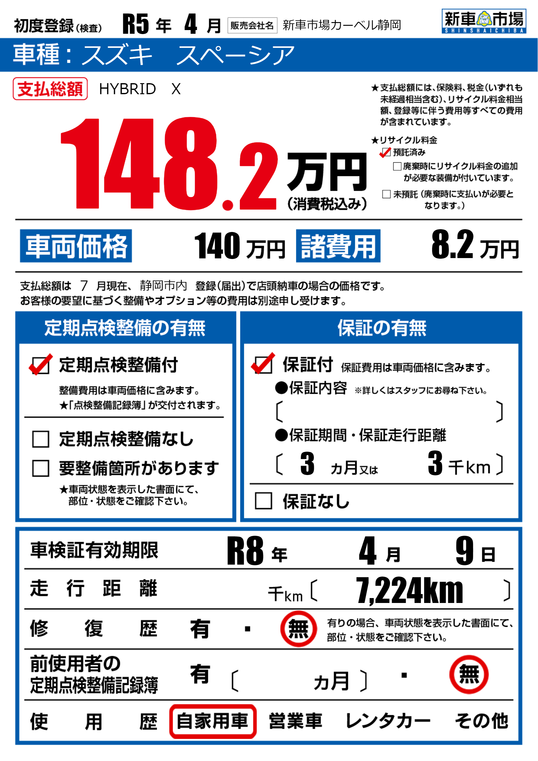 | 車名 | スズキ スペーシア | グレード ミッション 排気量 |