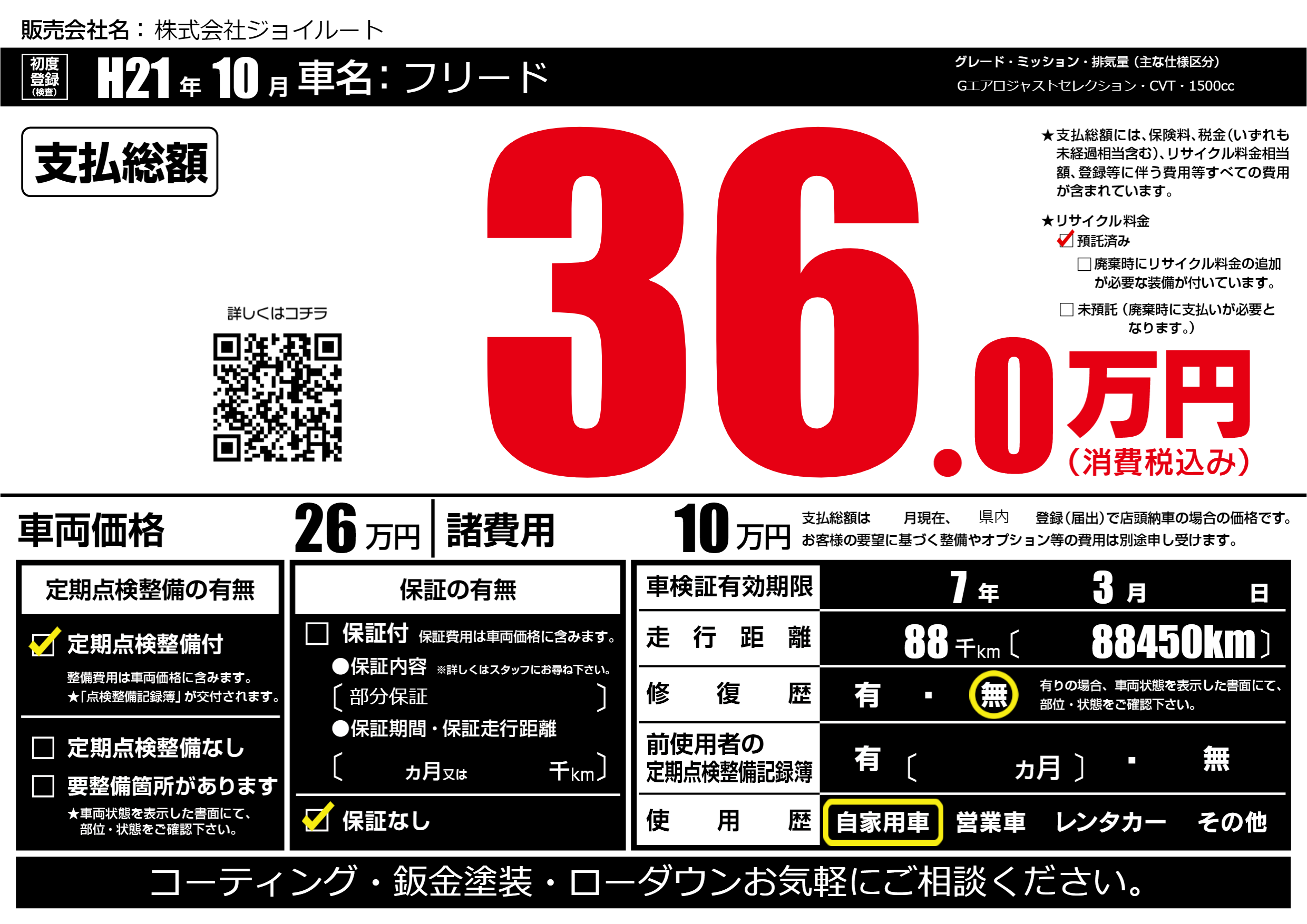 | 走行キロ | 8.8万km | 初年度登録 | H21年10月 |
