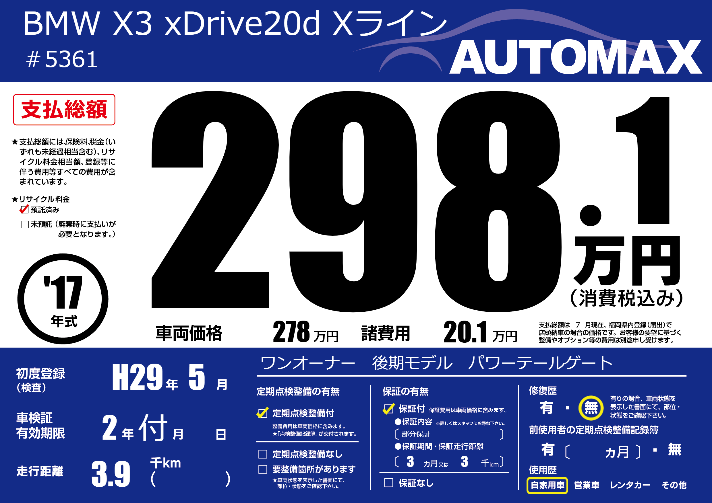 | 車名 | BMW X3 xDrive20d Xライン | グレード ミッション 排気量 |