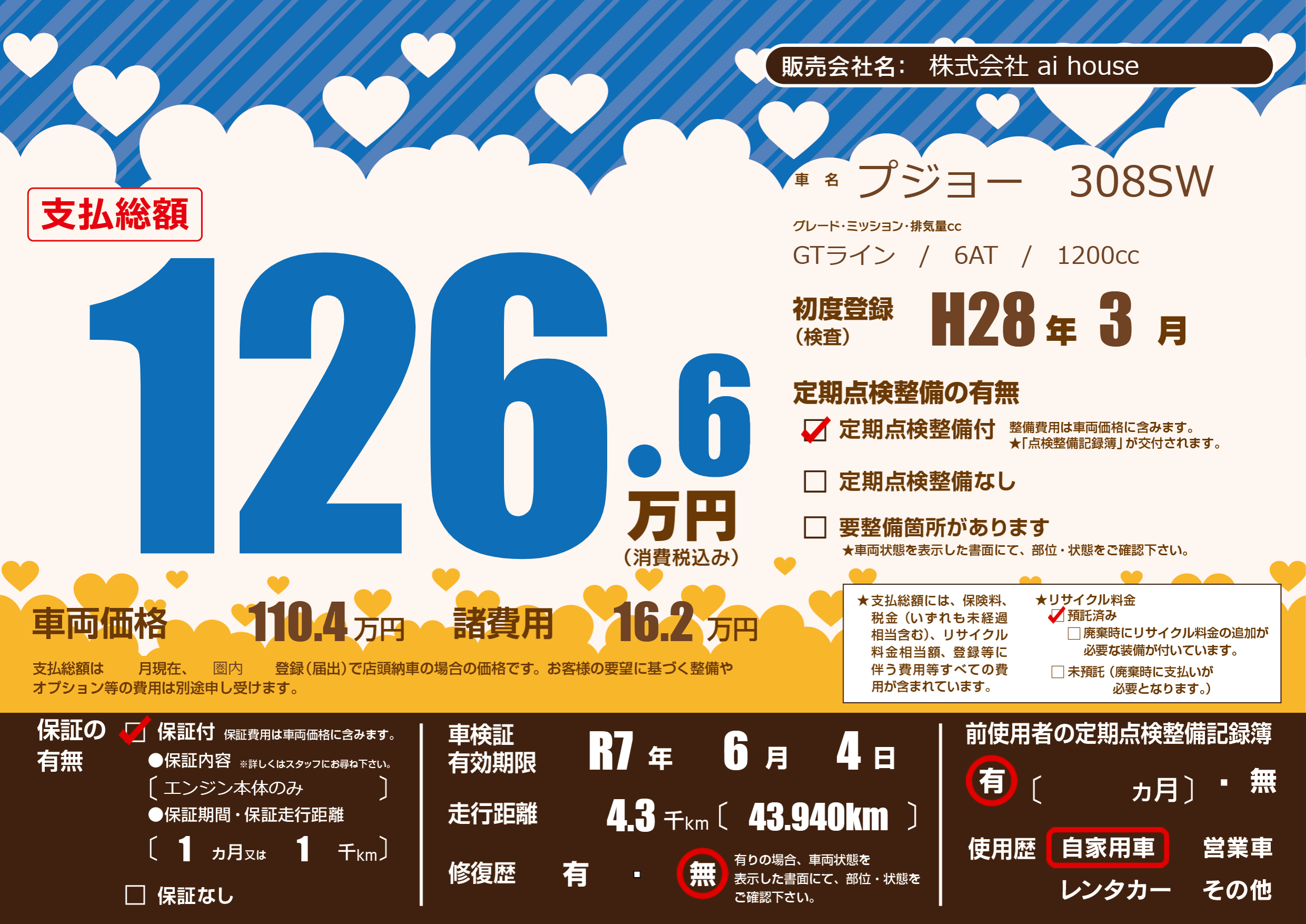 | 車名 | プジョー 308SW | グレード ミッション 排気量 |