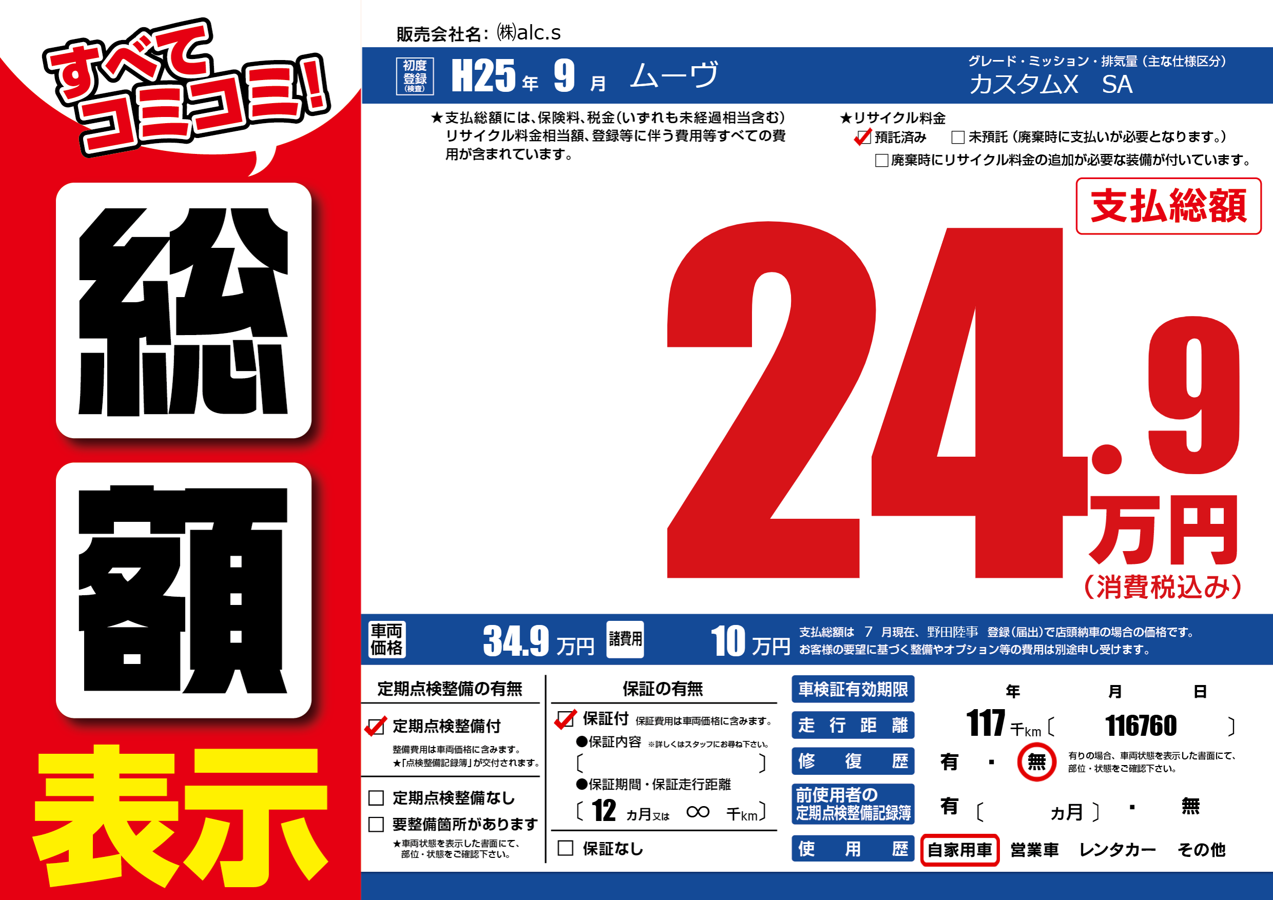 | 走行キロ | 11.7万km | 初年度登録 | H25年9月 |