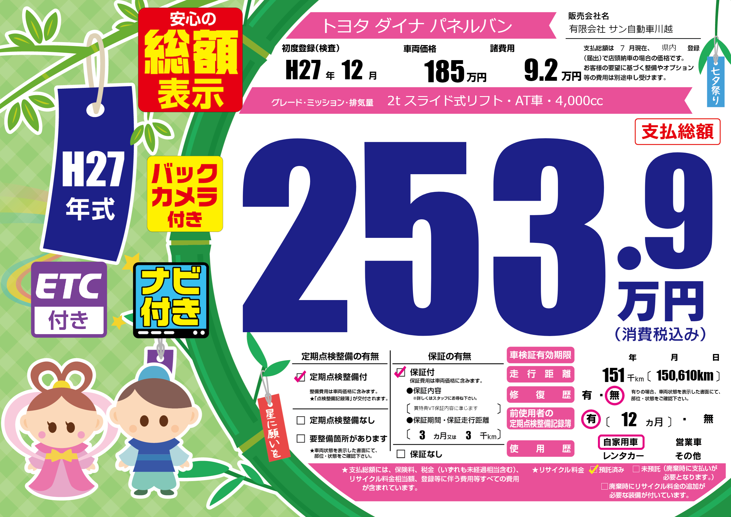 | 走行キロ | 15.1万km | 初年度登録 | H27年12月 |