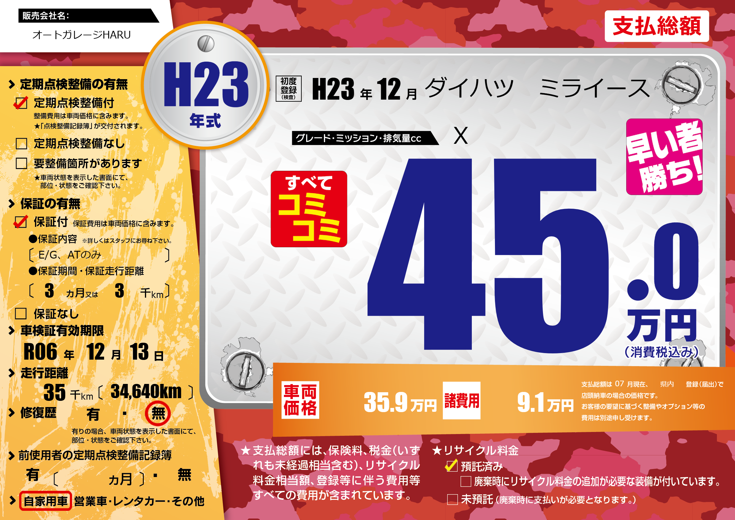 | 走行キロ | 3.5万km | 初年度登録 | H23年12月 |