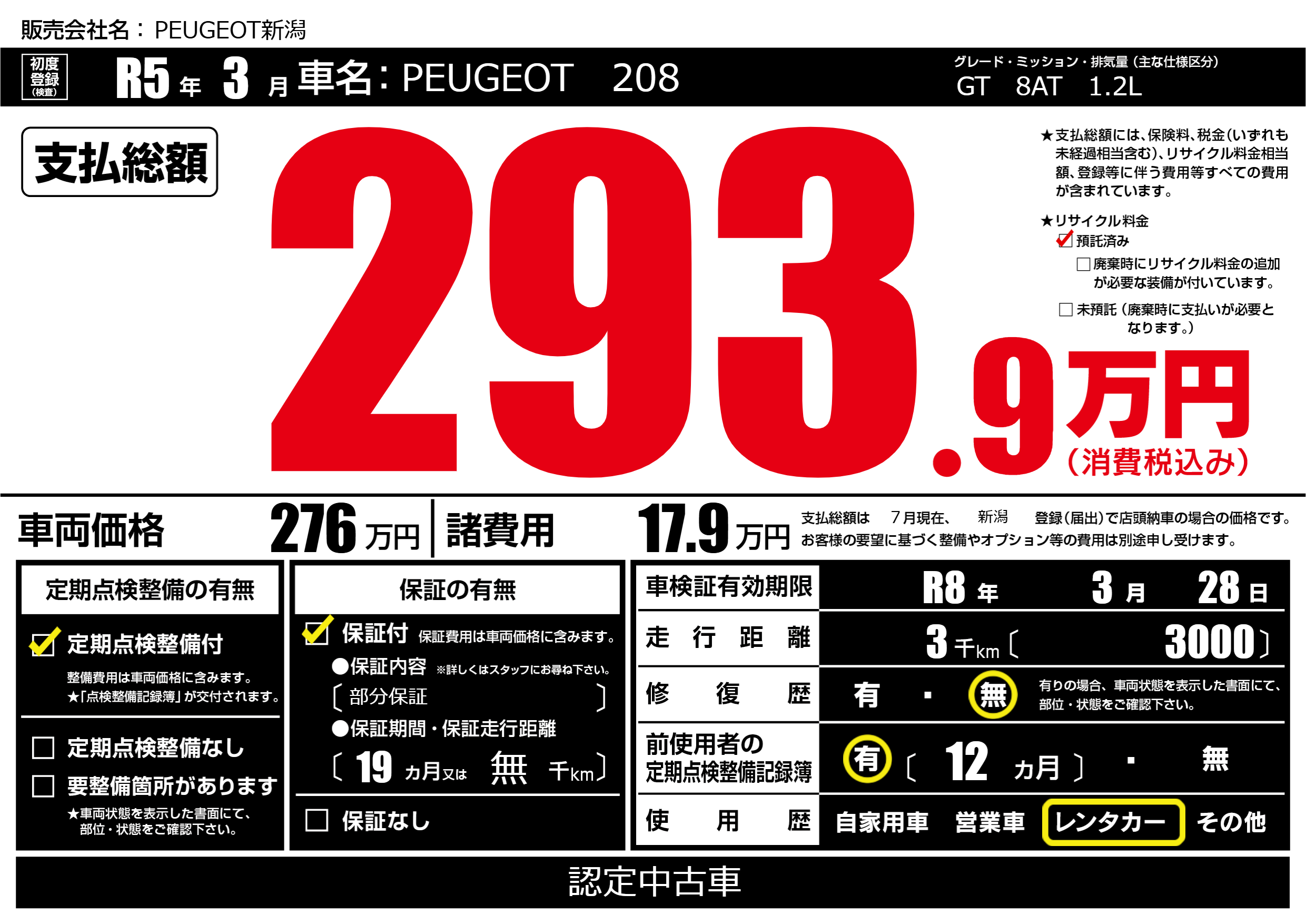 | 車名 | PEUGEOT 208 | グレード ミッション 排気量 |