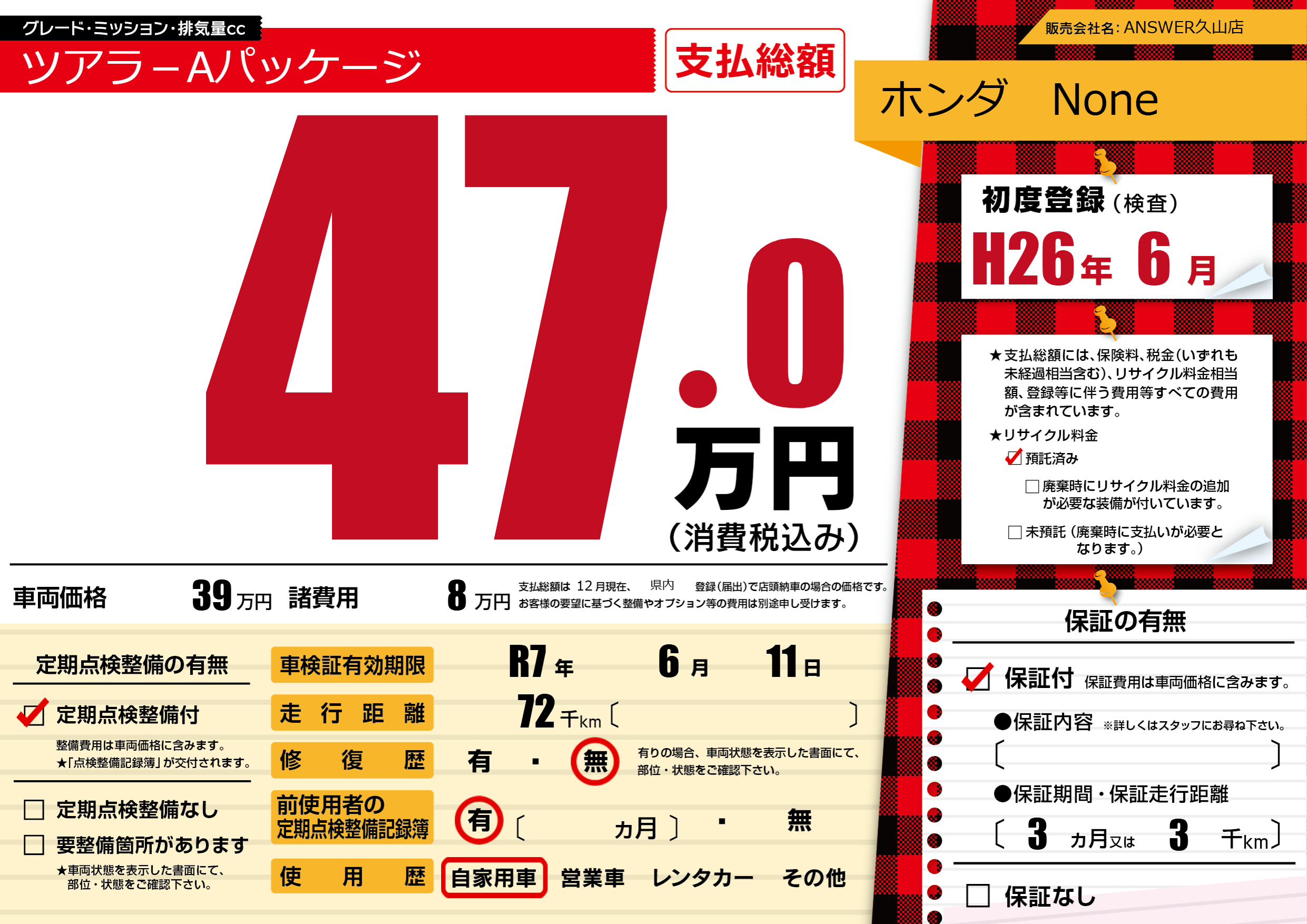 保証付き 保証内容(---) 3ヶ月または(3)千kmまで |