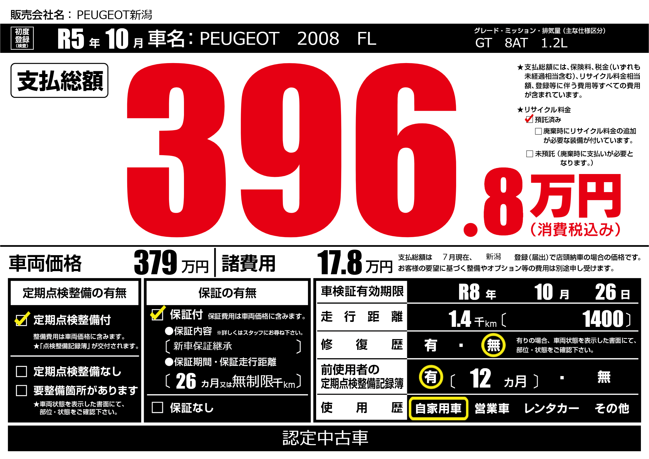 | 車名 | PEUGEOT 2008 FL | グレード ミッション 排気量 |
