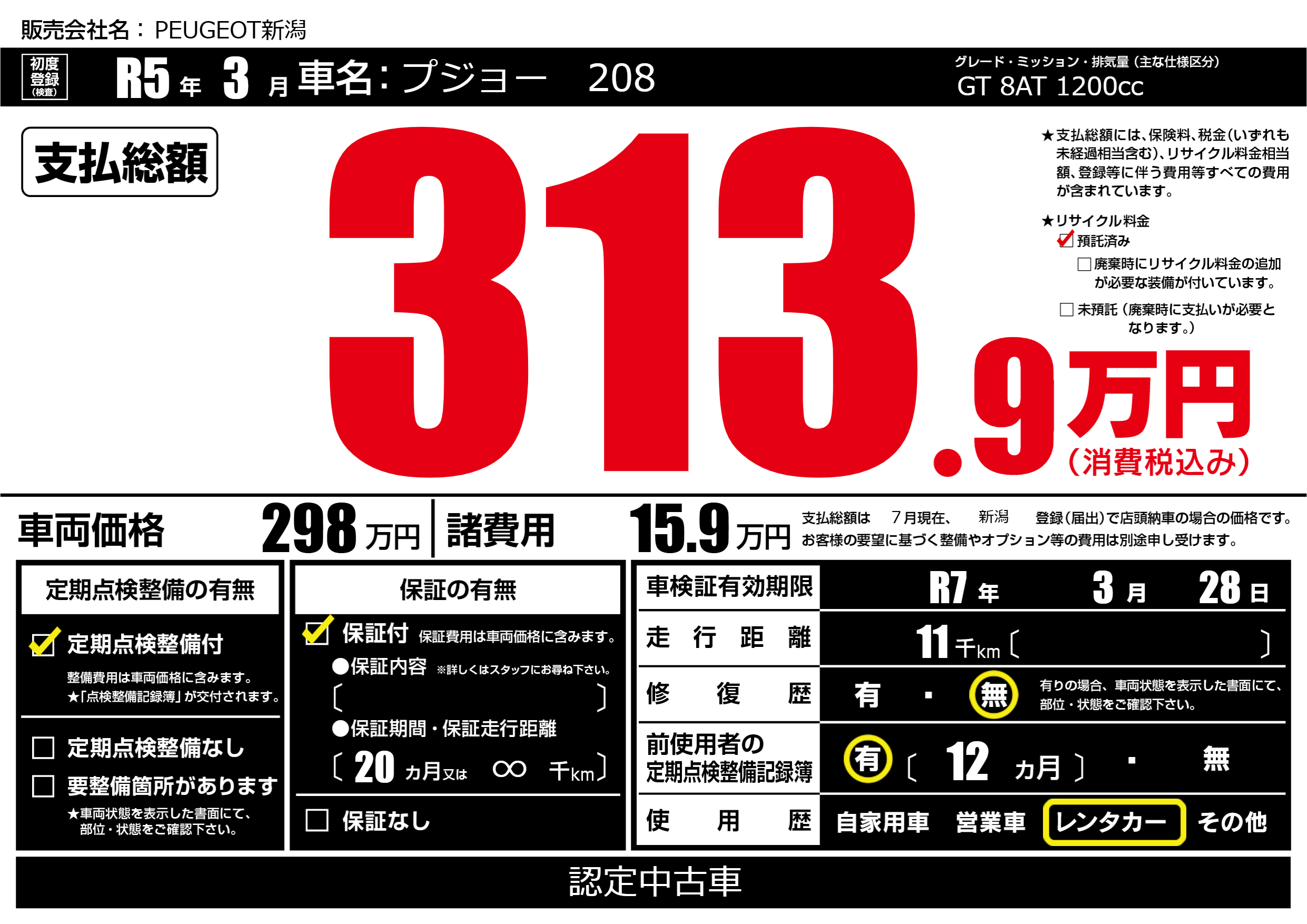 | 車名 | プジョー 208 | グレード ミッション 排気量 |