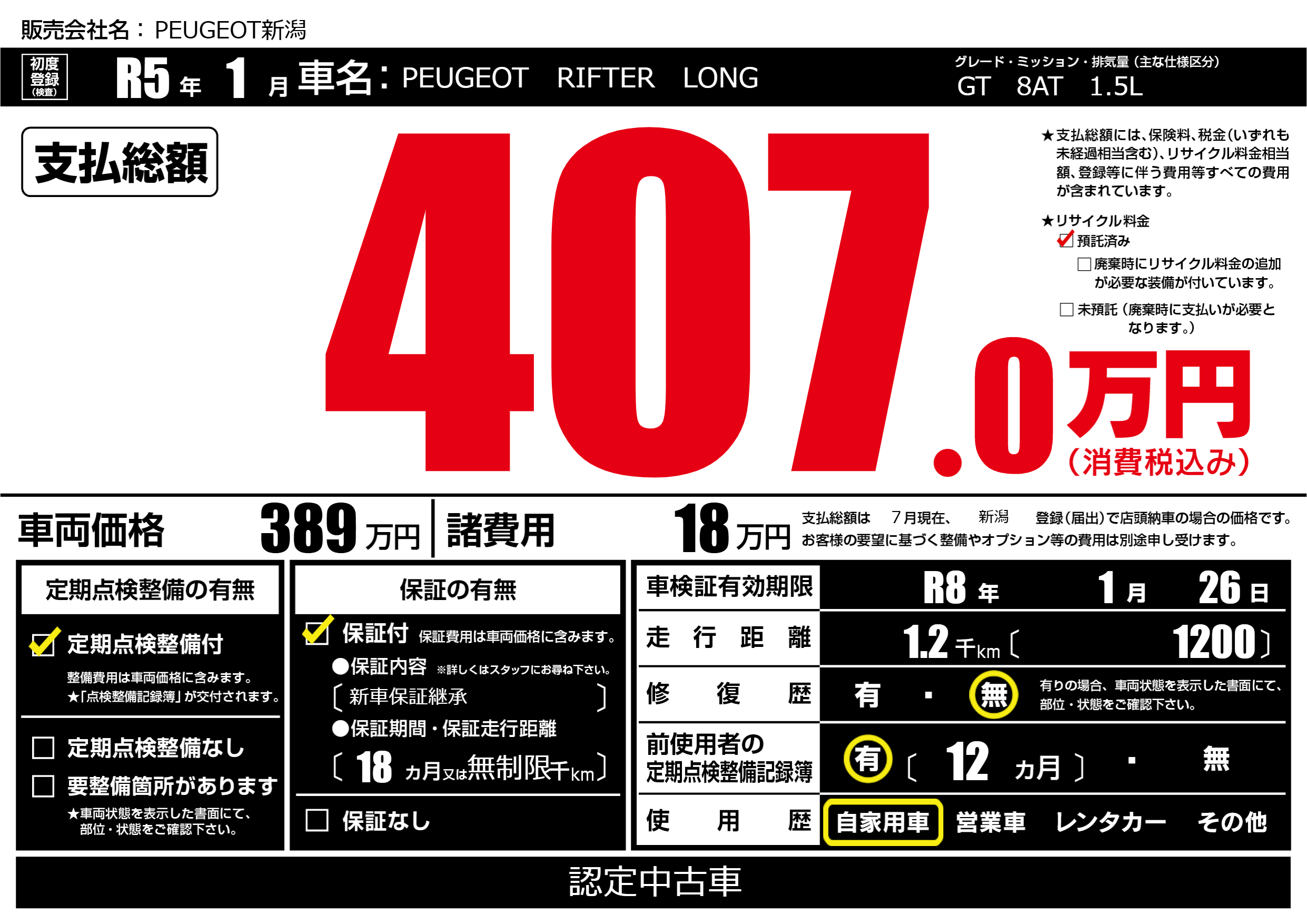 | 車名 | PEUGEOT RIFTER LONG | グレード ミッション 排気量 |