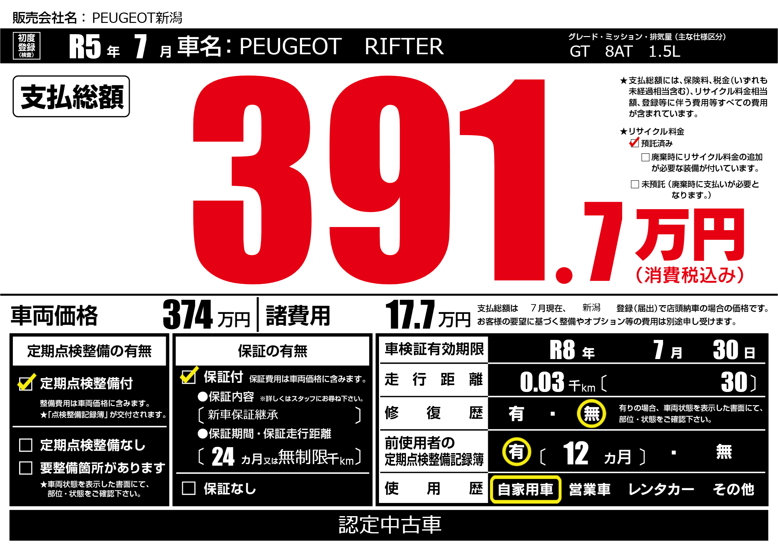 | 車名 | PEUGEOT RIFTER | グレード ミッション 排気量 |