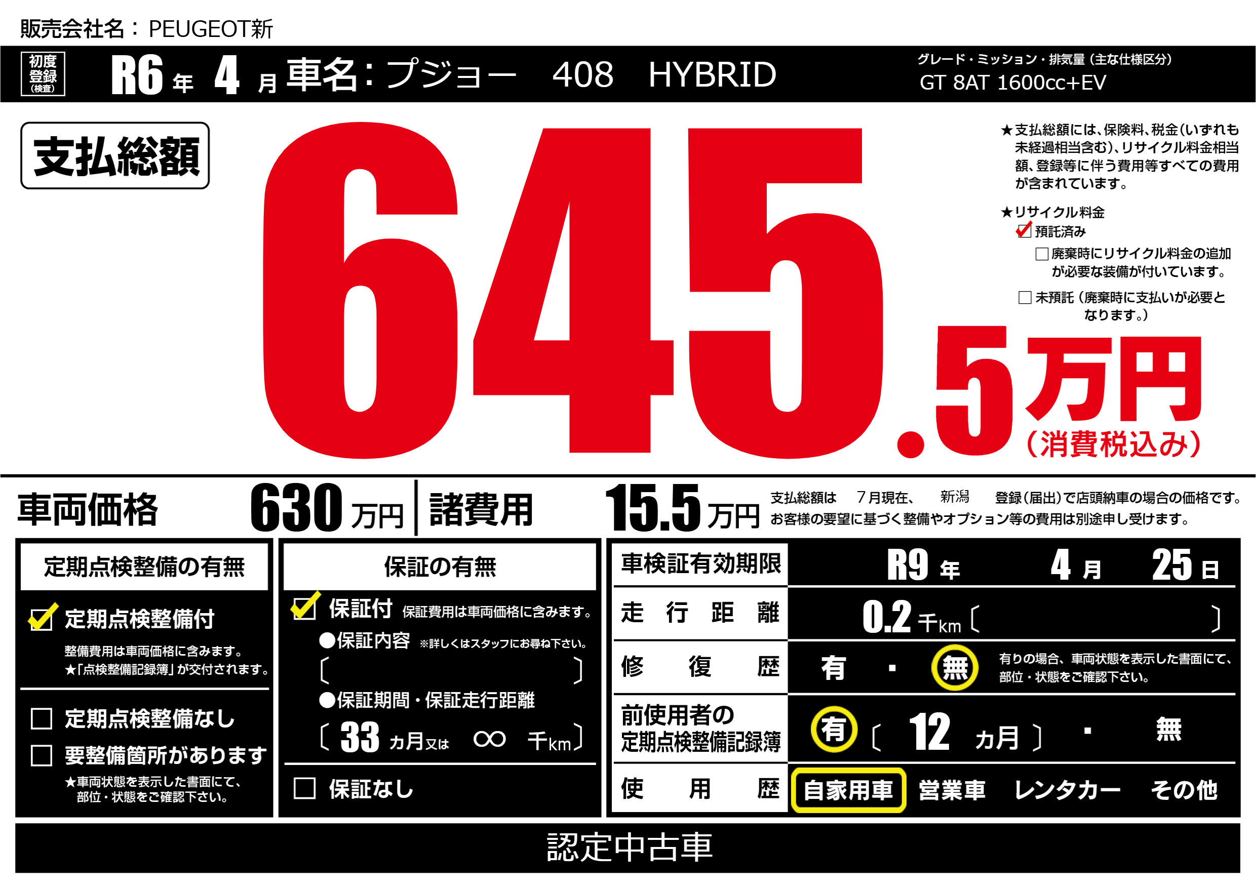 | 車名 | プジョー 408 HYBRID | グレード ミッション 排気量 |