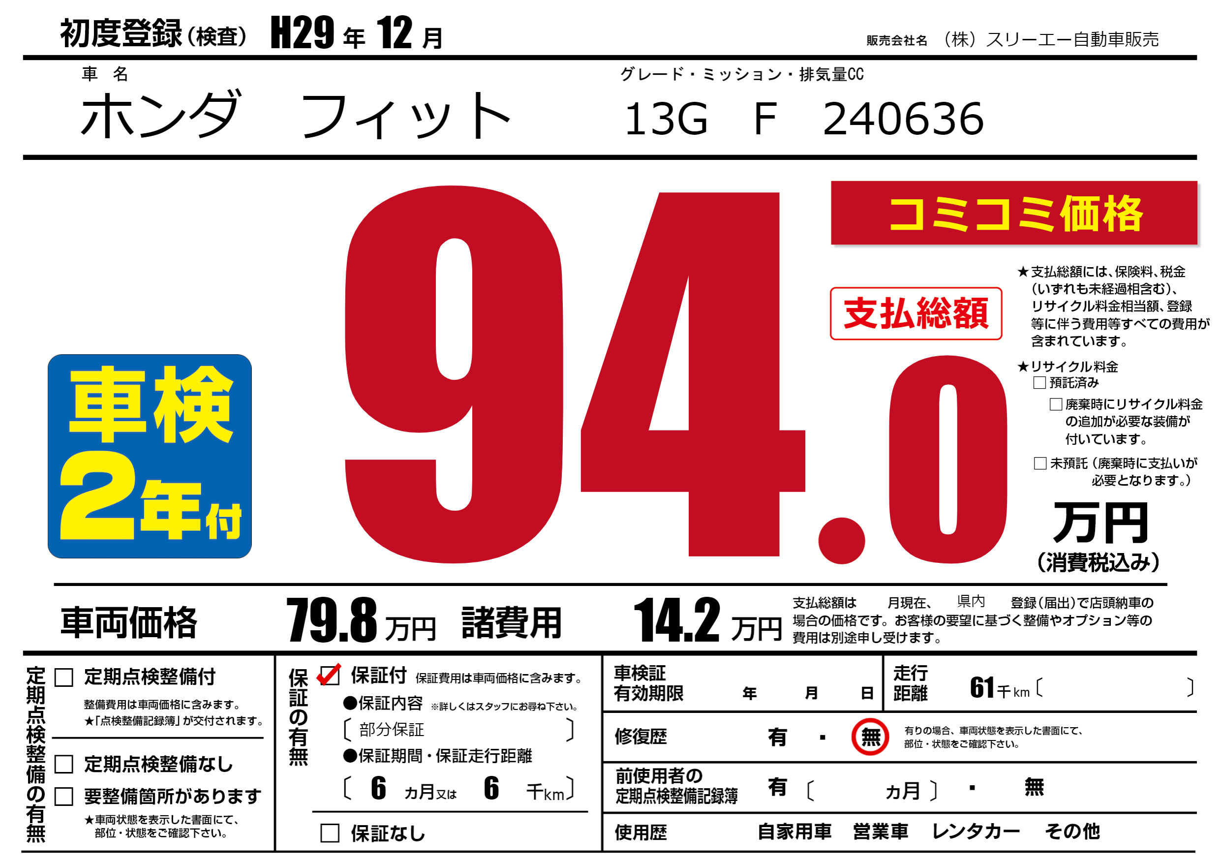 | 車名 | ホンダ フィット | グレード ミッション 排気量 |