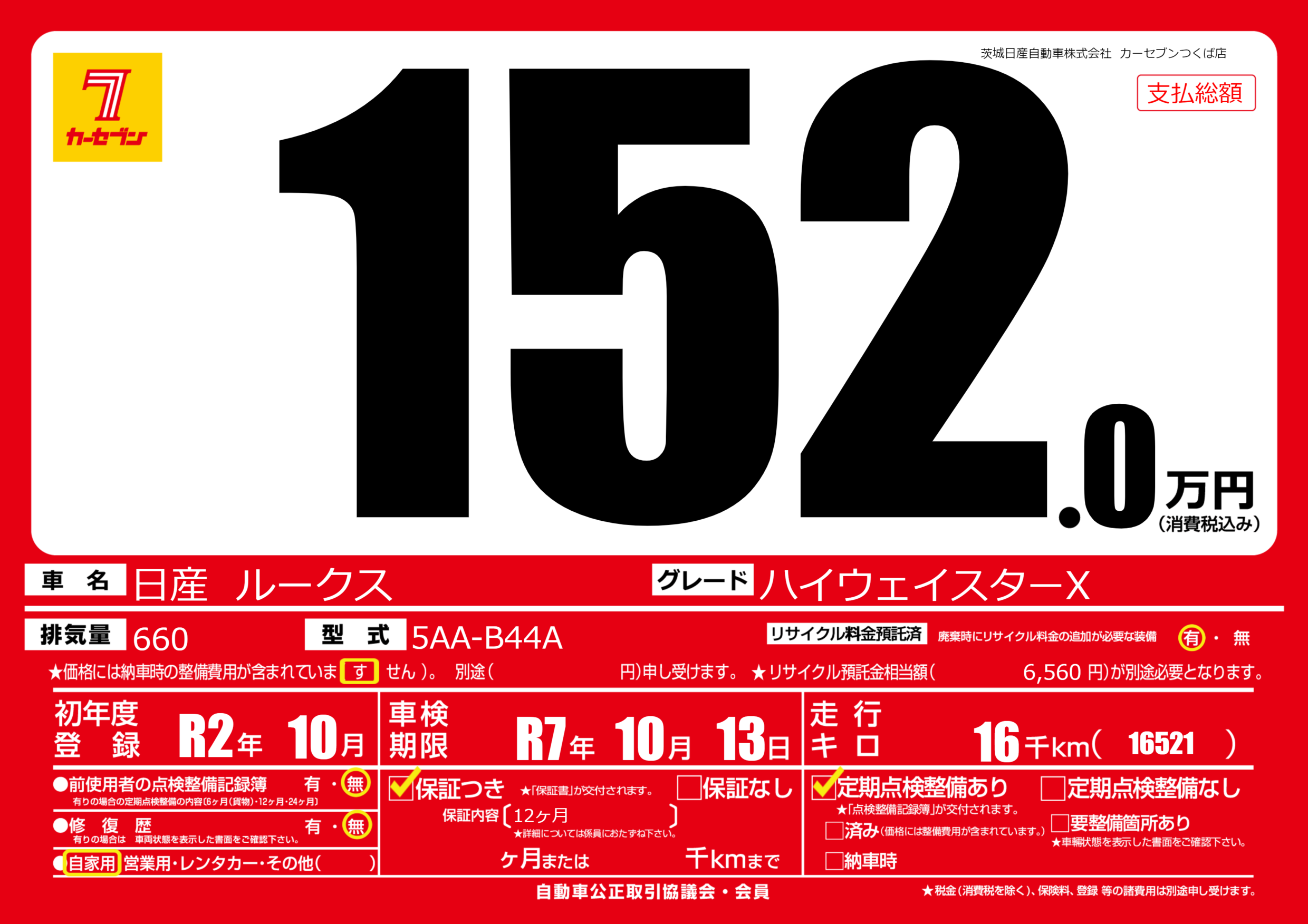 | 車名 | 日産 ルークス | グレード ミッション 排気量 |