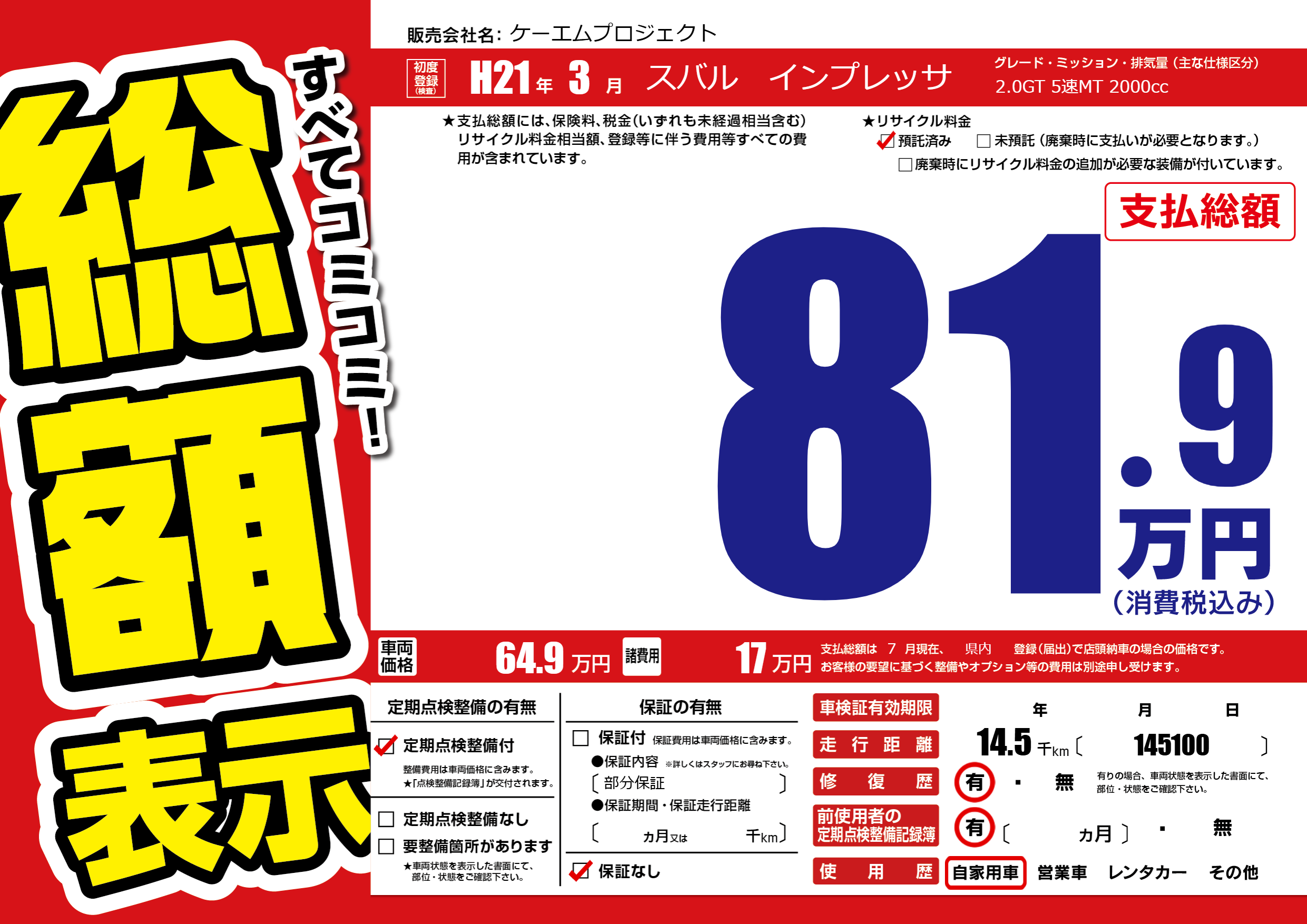 | 車名 | スバル インプレッサ | グレード ミッション 排気量 |