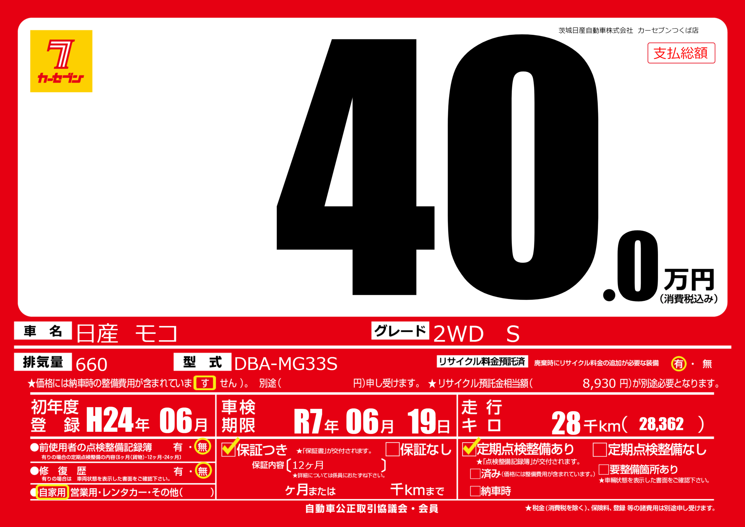 | 車名 | 日産 モコ | グレード ミッション 排気量 |